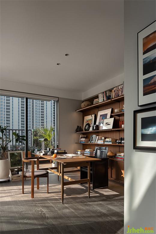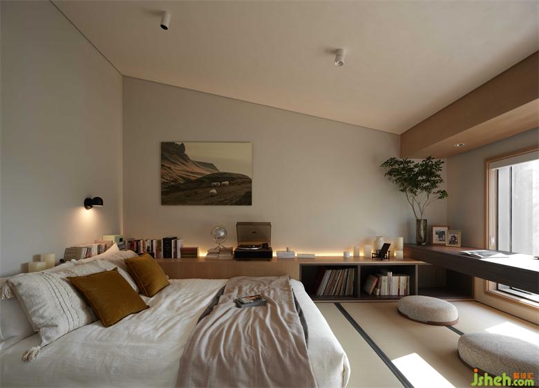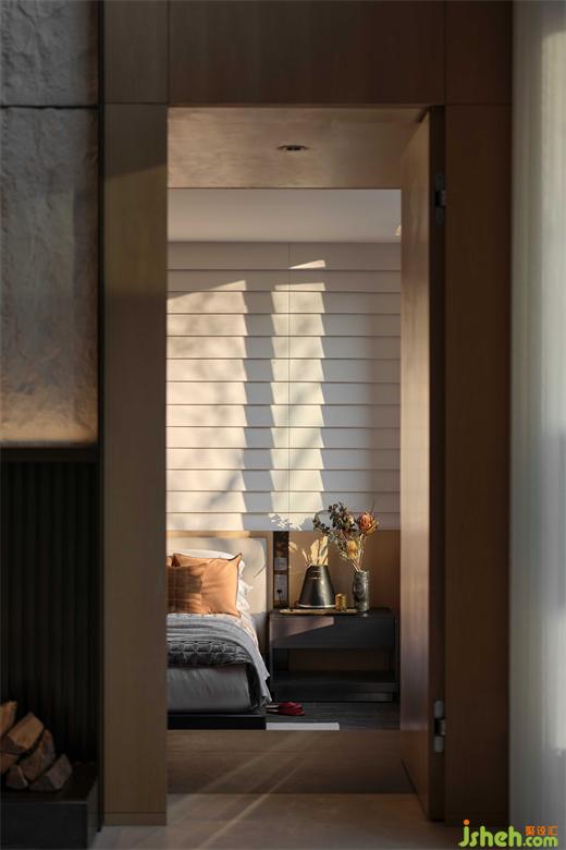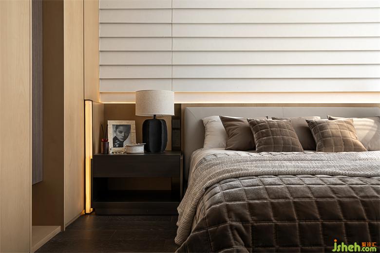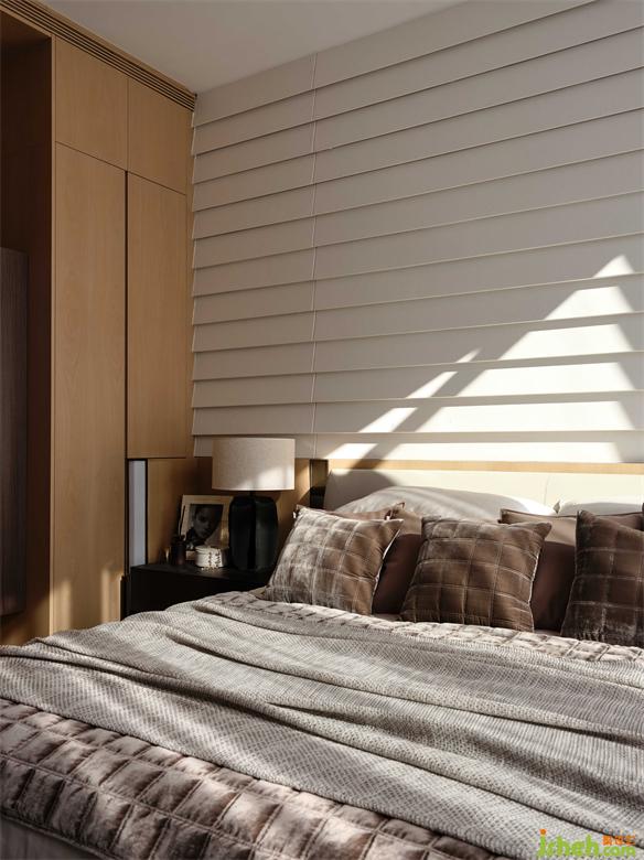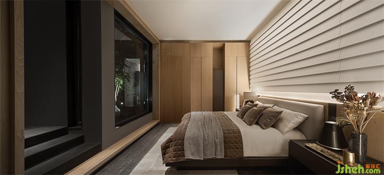 步入下沉式主臥,柔和的微風(fēng)揚(yáng)起窗紗,使視線正好平于庭院景觀。萬(wàn)科樣板房設(shè)計(jì)延續(xù)會(huì)客廳的設(shè)計(jì)理念,主臥的電視背景墻同樣被充滿生機(jī)的內(nèi)庭院取代。