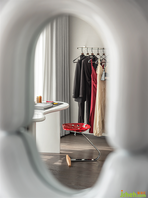 圓潤造型的包裹感沙發(fā)和白色馬卡龍桌子相得益彰,溫潤的米色地毯搭配黑色幾何線條,柔中帶剛。閑暇時,品一杯紅酒,翻看鐘愛的時尚雜志,自我沉浸,可愛獨特的橢圓形白色鏡面代替了傳統(tǒng)的掛畫,每個角度都像一幅藝術(shù)畫,隨手一拍便是氛圍大片。