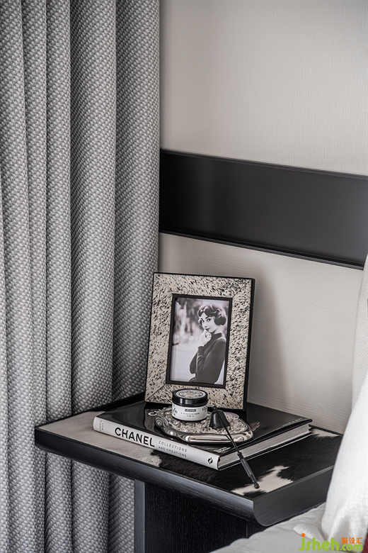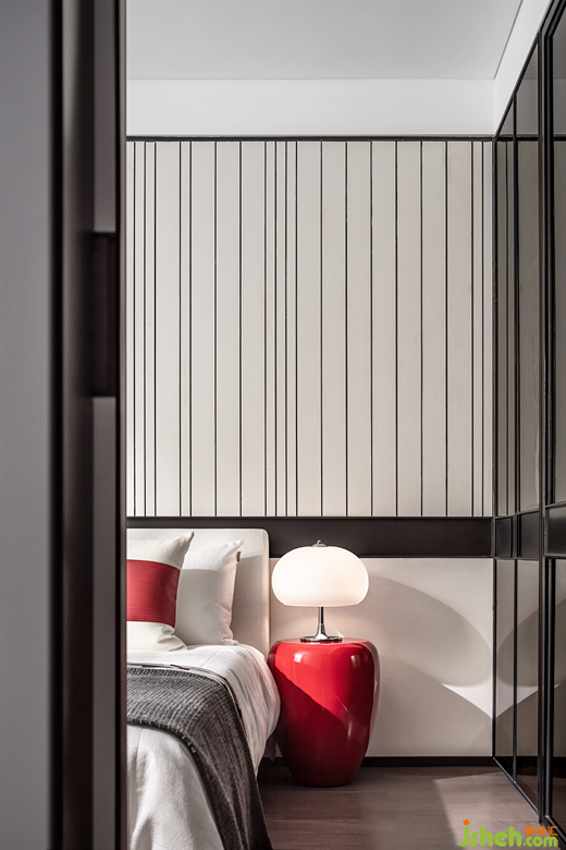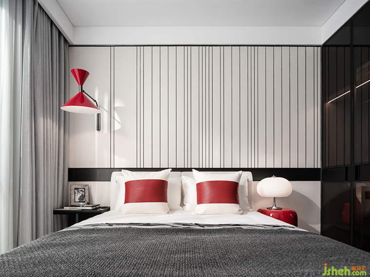 臥室是心靈與身體的庇護(hù)所與能量場,以大面積的經(jīng)典黑白為基底,對比強(qiáng)烈,墻面線條利落有序,不規(guī)則的間隔更顯個性與時尚,局部點綴紅色造型燈具和曼妙弧度小圓桌,既不沉悶,又延續(xù)了空間的整體主題與調(diào)性。