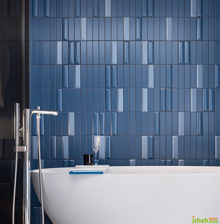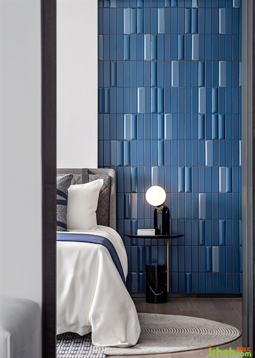 特別定制的藍(lán)色系床頭磚型背景材質(zhì)延伸至浴室區(qū),彌漫著主人無處安放的藝術(shù)的追求,獨(dú)一無二卻又不顯突兀。