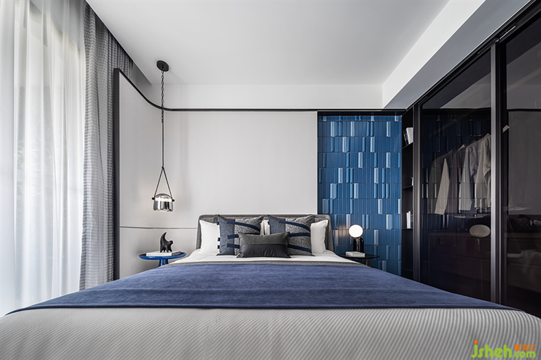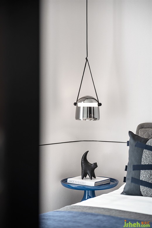 臥室延續(xù)了空間設(shè)計(jì)的整體性與一體化,比例和諧的藍(lán)白搭配又一次被完美詮釋。深圳樣板房設(shè)計(jì)現(xiàn)代金屬質(zhì)感的精致吊燈,異形的黑色小雕塑,無一不展示著主人的極高的審美品味。