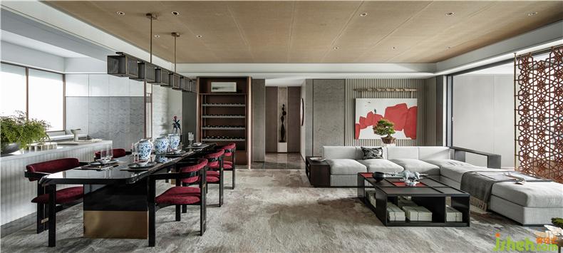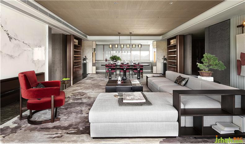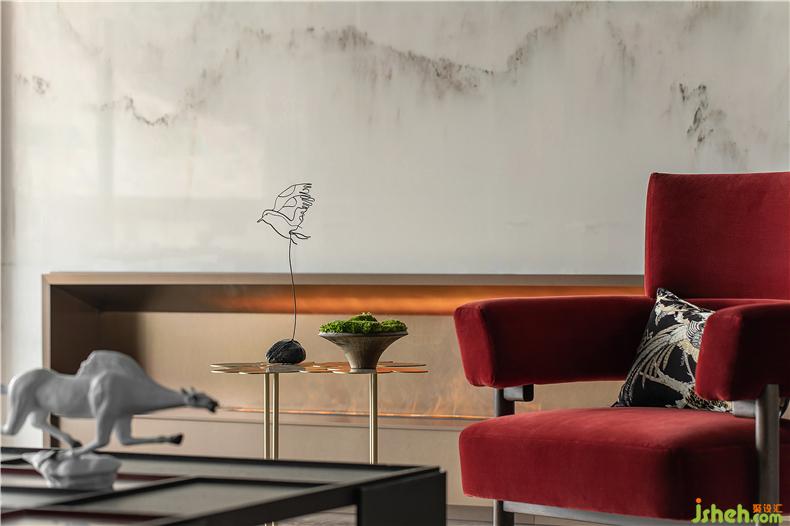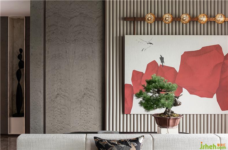 紅,是東方的色彩。當(dāng)它出現(xiàn)在一個(gè)空間中,視線總會(huì)被其引領(lǐng)。恰如我們步入這個(gè)開(kāi)闊連通的客廳與餐廳,一眼就瞥見(jiàn)那幾點(diǎn)別樣的紅色。于是聚焦,然后散瞳,周圍雅清的陳設(shè)逐漸清晰起來(lái):沉穩(wěn)的深色基調(diào)里,雀眼影木材質(zhì)的飾面墻板從名字到紋理都展露出一種東方的詩(shī)情;樣板房設(shè)計(jì)電視墻所用的石材自帶山水紋樣,不論遠(yuǎn)觀還是細(xì)看,目光都如在一幅元代水墨畫中逡巡,簡(jiǎn)筆之中卻有無(wú)盡意;餐桌椅和茶幾選用了帶著漆器般幽光的深色,含蓄蘊(yùn)藉,心下自得安寧。而淺灰色沙發(fā)與淺褐色地毯仿佛暈染,在耀眼的紅色與沉郁的深色基調(diào)安然過(guò)渡。