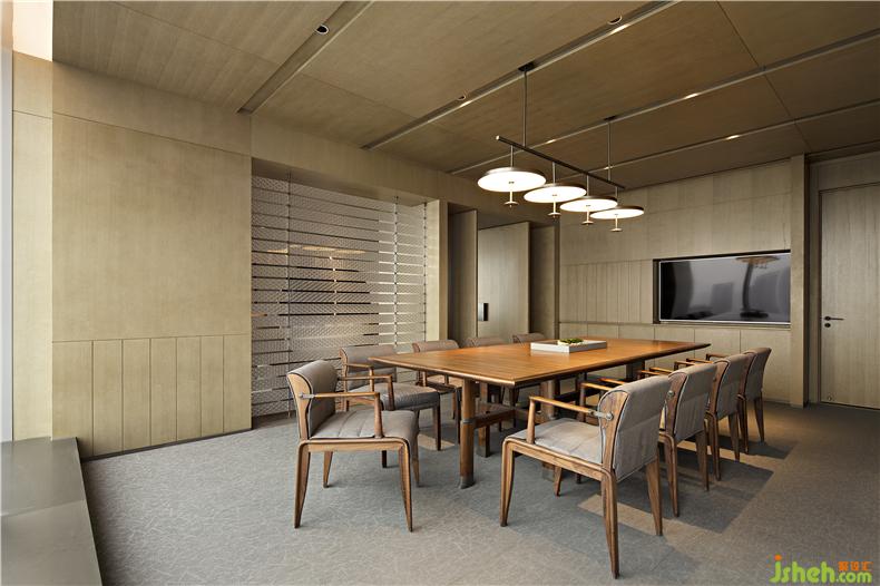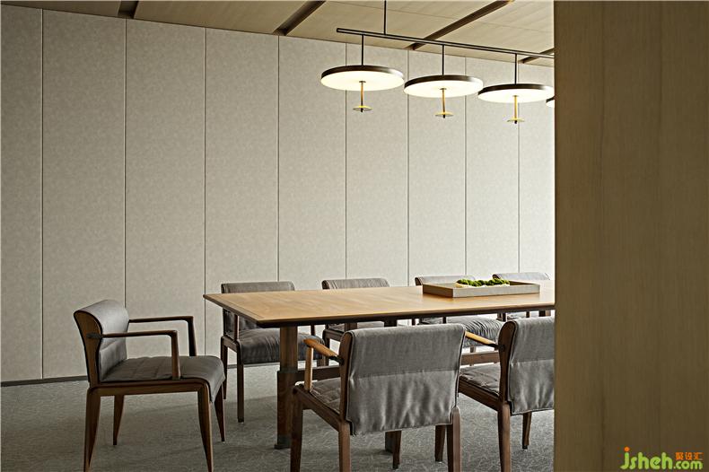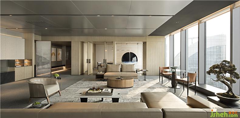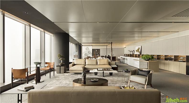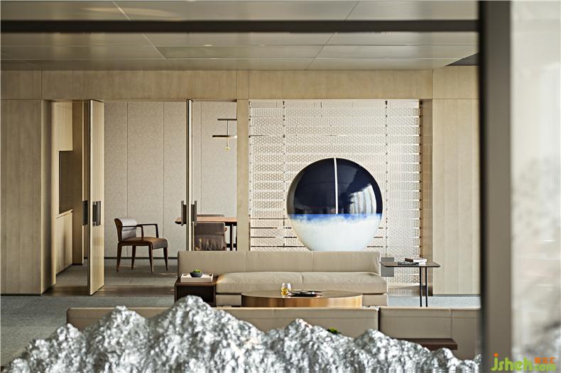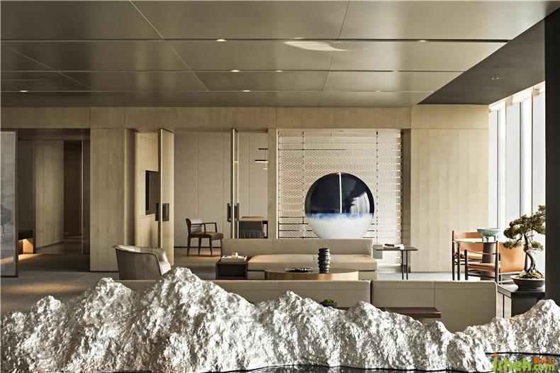 平面格局上劃分了接待、洽談、茶室、水吧、會議室、會所設計休息室等功能區(qū)域,滿足不同的體驗需求,每一個空間都充斥東方禪境的清凈與陶然。進入接待空間,內部剔除復雜裝飾回歸淳樸,以自然肌理為主色調,點綴著藤編藝術品,營造出安穩(wěn)放松的氛圍;洽談區(qū)域一面是開闊的都市叢林景色,一面是返璞歸真的自然禪境。會所設計透過窗可欣賞到天然景色,開闊的視野恰如其分輝映著主人的胸懷與格局;室內樸實雅致的氛圍,又展現(xiàn)出怡然自得:原木與硯臺石構造了室內茶亭。會所設計自然肌理石材砌造的吧臺搭配純色家具;亮銀色山巒雕塑、水墨藝術裝置、山水屏風,以及青松盆景的點綴,既似烏托邦的隱喻,又如現(xiàn)代化的鏡像,使整個空間在極簡的古韻中,滲透幾許現(xiàn)代品味?;蛲A?、或游走、或靜坐,在毫無刻意手法營造的室內空間,處處感知高山流水之雅意。