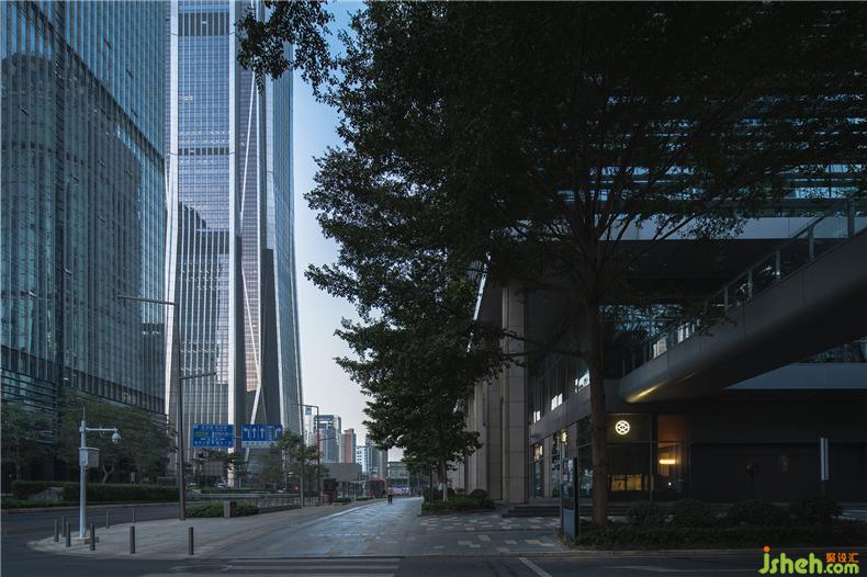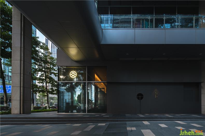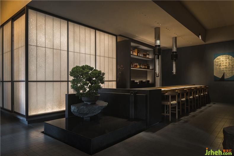 華燈初上,宛如日本家徽?qǐng)D案的“炎”字LOGO從門(mén)店臨街的玻璃門(mén)上映射出光環(huán),餐廳設(shè)計(jì)讓路過(guò)的人得以辨析這并非是無(wú)人之境;與倒映之上郁郁蔥蔥的疏影層疊,又平添幾分望不穿鋼筋水泥與自然綠意交織的神秘未來(lái)感。