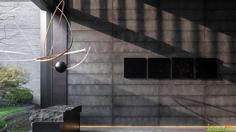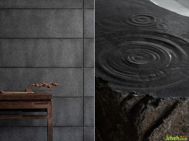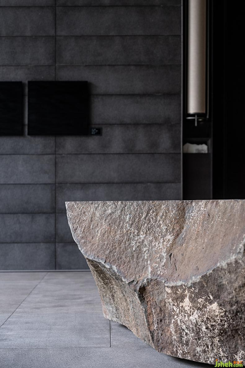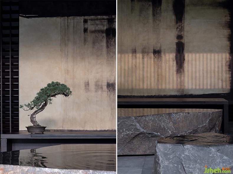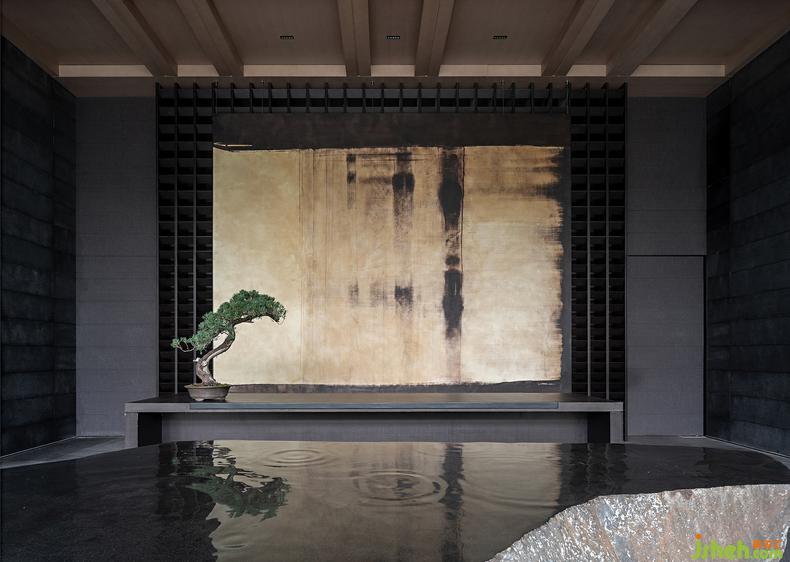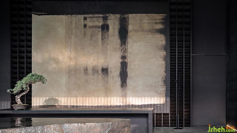 在這般滴翠的綠意中,掩映著一座與庭院共生的“閣子”,由深灰色格柵圍構(gòu)起的建筑去掉一切多余,被抽象為最簡(jiǎn)凈的線條和空間,摒棄矯飾反得一種純粹的哲思,這樣的空間精神也讓人自然生出返觀內(nèi)省的安靜。因?yàn)樾撵o下來(lái),感知與思考也被無(wú)限放大,于是使用透光障子的天花將自然光引化為“光陰的故事”——古人說(shuō)時(shí)間是光陰,這其中已然含有明暗交替的空間感。會(huì)所設(shè)計(jì)再加上庭院里通過格柵透入的自然光,這個(gè)空間竟然又將時(shí)間凝固了。身在其中,不論是靜立或徜徉,都如在閱讀歷史的詩(shī),觸摸當(dāng)代的云,浴沐湖面的風(fēng),是五感交織的神游。