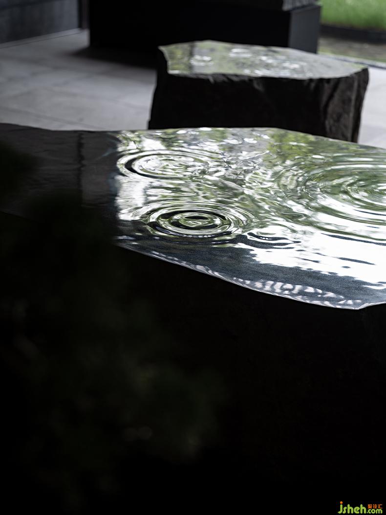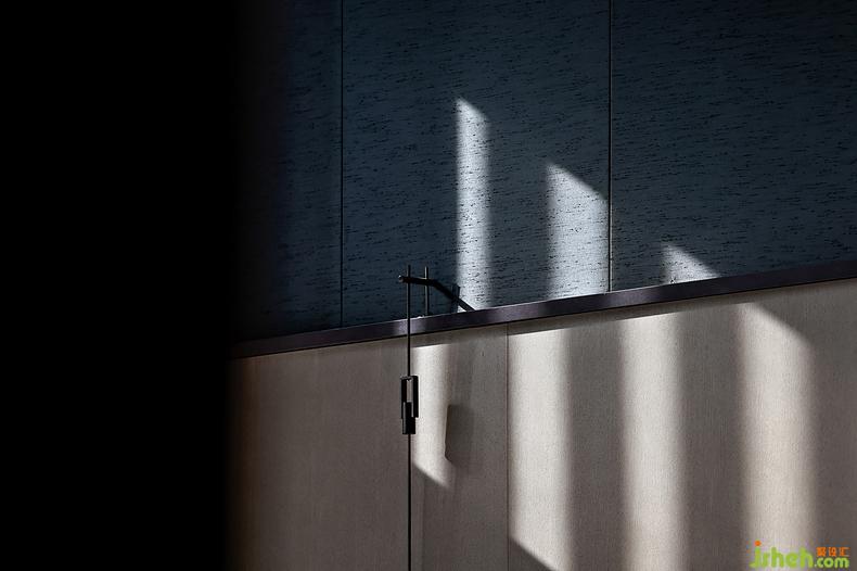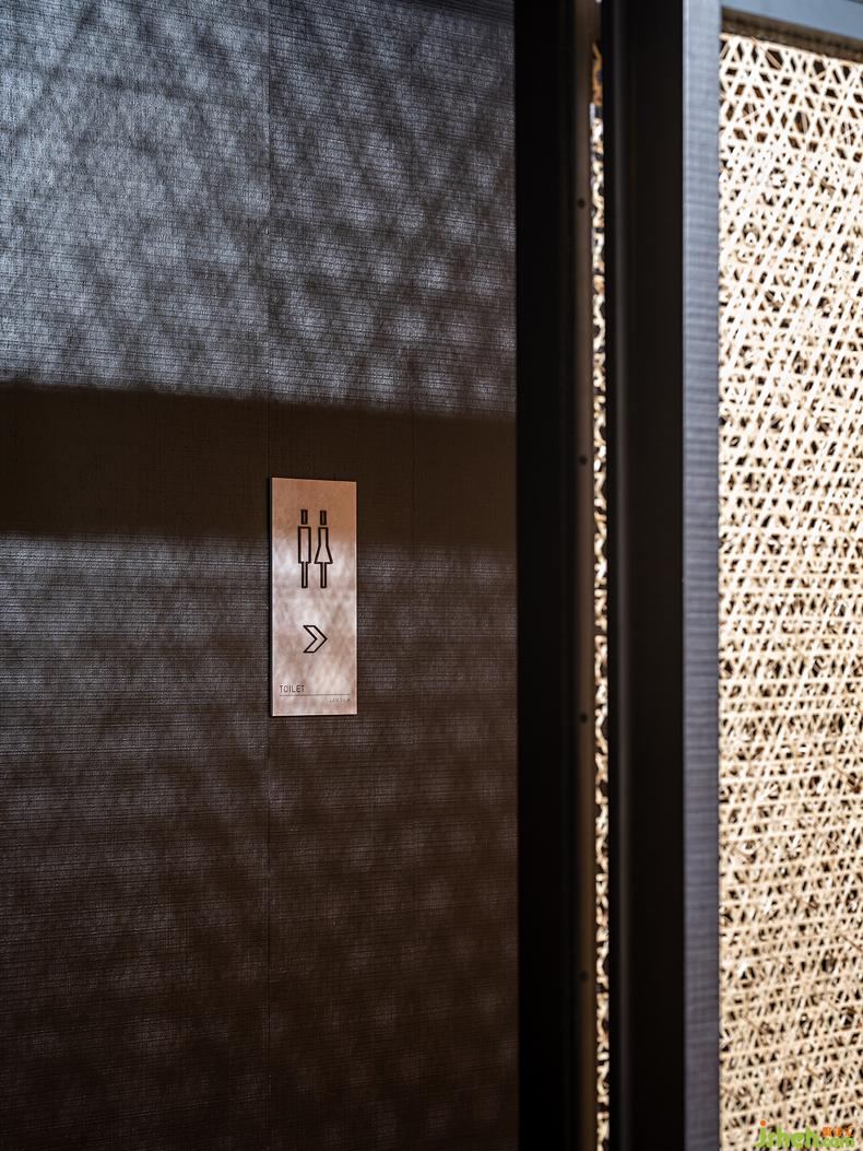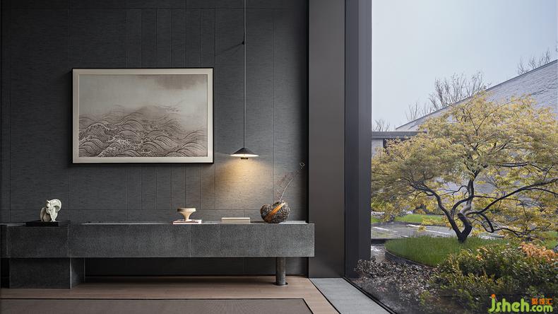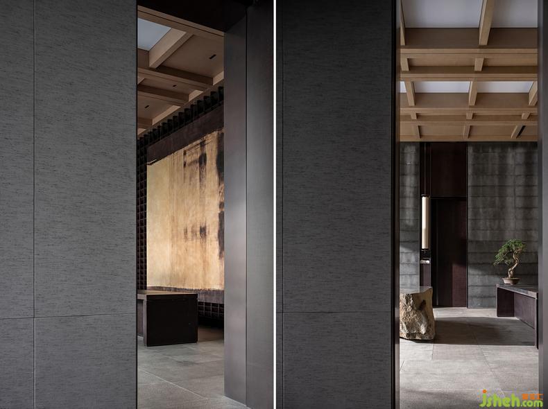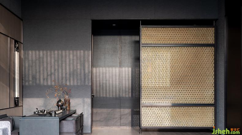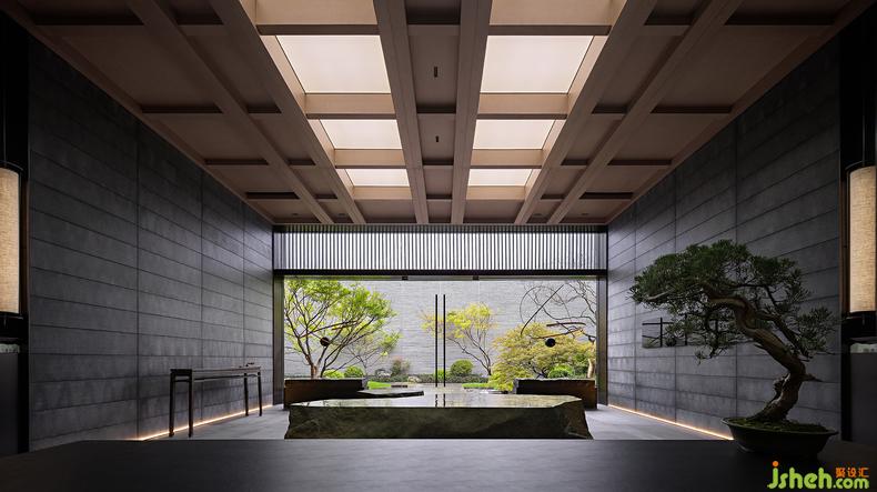 而靜謐的深灰色統(tǒng)一了這個空間的基調(diào),不論是深灰色石材的自然肌理,還是深灰色木質(zhì)紋理的自然觸感,再加上通過障子“過濾”的天頂光與經(jīng)過格柵“鏤雕”的庭院光的加持,整個空間呈現(xiàn)出一種明滅幽玄的妙境,仿佛一首關(guān)于時之光的詩歌,令人沉浸。但正面墻上的亞光砂金色墻面藝術(shù)裝置則如一件巨幅的金箔書法作品,引人直視,簡潔的畫面在引發(fā)時空向往的同時,會所設(shè)計也帶來不容忽視的精神力量。而前景處一棵造型窈裊的松樹盆景則為這份當(dāng)下的力量注入一縷高古的幽邃,配合著兩尊自然隨形的石臺水景,有風(fēng)過處漣漪跌蕩,讓人的心也隨之滌清濾凈。