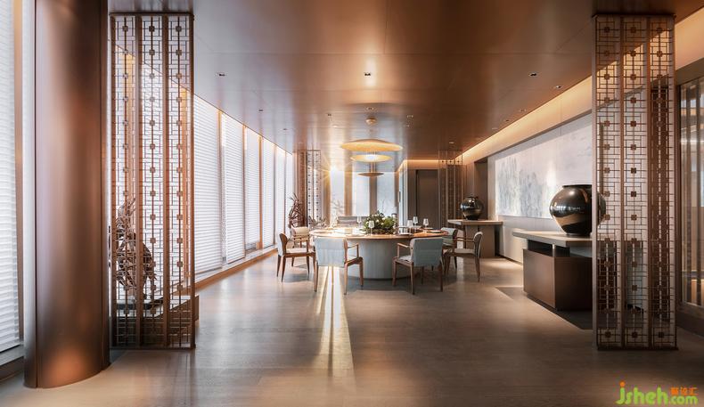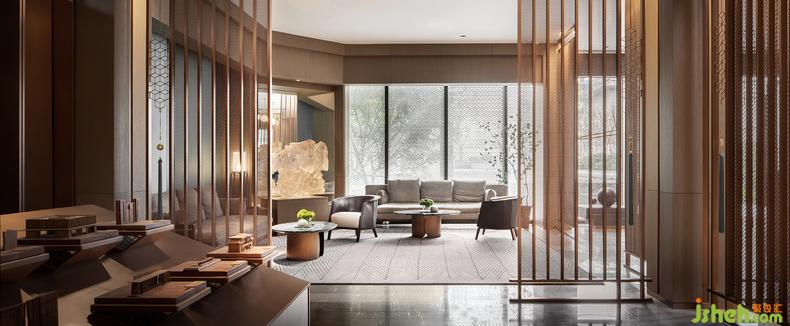步入二層功能區(qū),是另外一座江南院落。雖與無江南園林常見曲折回廊不同,銷售中心設(shè)計(jì)是以頗具對稱美感的切割空間,再通過落地玻璃窗將這最優(yōu)景觀面納入室內(nèi),進(jìn)一步消弭了室內(nèi)與室外、人與自然的區(qū)隔。