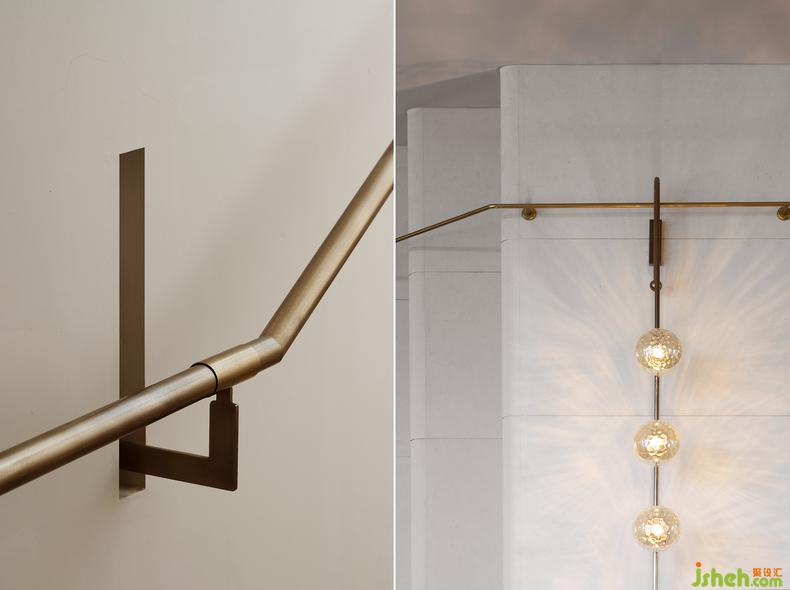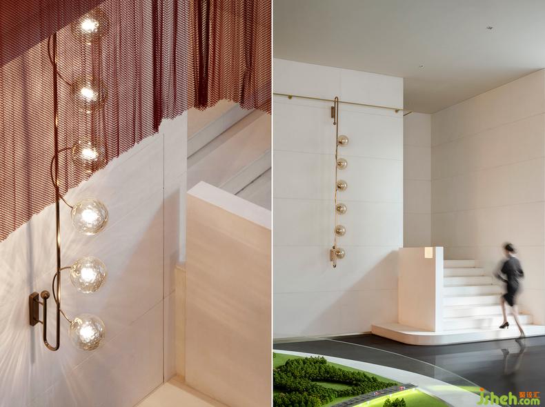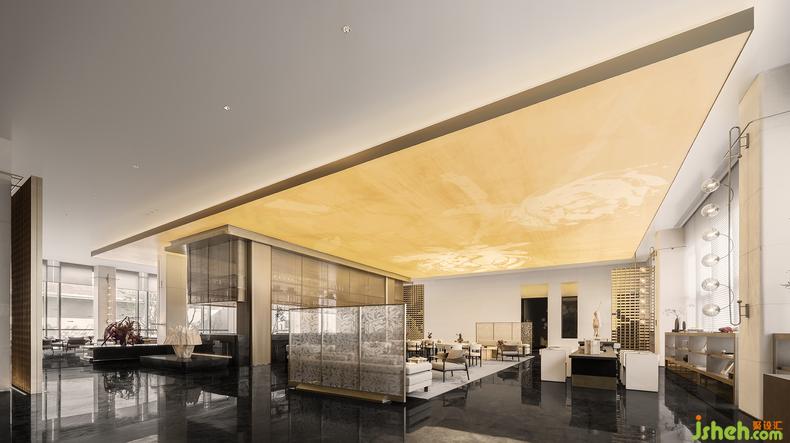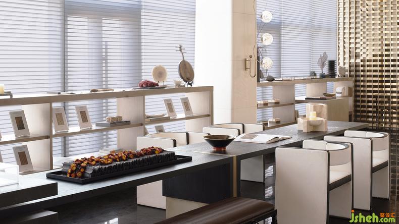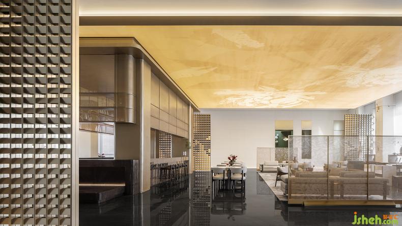 一旁的洽談區(qū)同樣疏朗曉暢,在大面積米色飾面的中性穩(wěn)定基調(diào)下,生活館設(shè)計(jì)沿用于此的金屬屏風(fēng)與金色紋樣感的天花吊頂就像大漠日影般,竟有了某種激蕩的流動性。這也為本該神秘的異域風(fēng)情注入了現(xiàn)代東方的隱性力量。至于這股流動感,則被壁上的紙藝燈具掛飾接續(xù)下去,其似大風(fēng)吹過沙丘般的形態(tài)肌理自帶藝術(shù)的能量,再與空間中大體量的紅色東方花藝裝置相互映襯,于是這里原該是日不落般的絢爛遼闊與胡楊林式的明麗熱情都被一股中正的靜氣控制住了。座位沿落地窗一側(cè)鋪開,直面戶外水景的柔麗,也擁有更明凈的光影效果,正好中和了室內(nèi)的“大漠能量”。于是,日光屬于你,但并不炫目;大漠屬于你,卻絕不焦灼,唯留下一室篤定與從容。