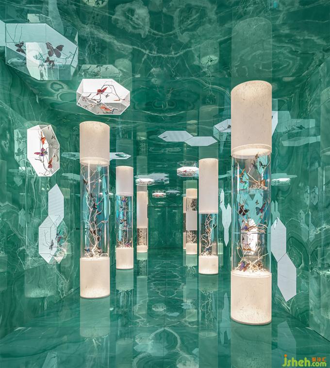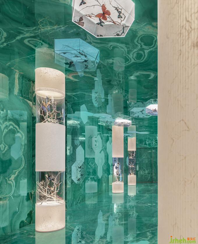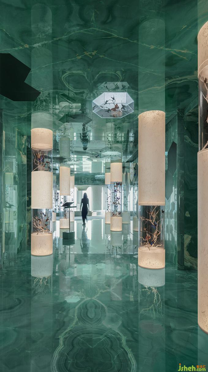 杭州餐廳設(shè)計項目涵蓋入口通道、接待茶區(qū)、用餐大廳以及不同主題基調(diào)的包房系列,以環(huán)形的動線貫穿整層的體驗閉環(huán)。慣看現(xiàn)代都市的倍速機械加工,電梯廳花園以變幻流動的光影包裹自然手作的精妙與單純,餐廳設(shè)計綠玉石、玻璃與蝴蝶環(huán)繞的沉浸式超現(xiàn)實秘境,帶來推門而入的感觀驚喜和情緒轉(zhuǎn)換,與樓宇林立的CBD背景和所在建筑的辦公屬性既是形式上的割裂又互為內(nèi)容的補充。