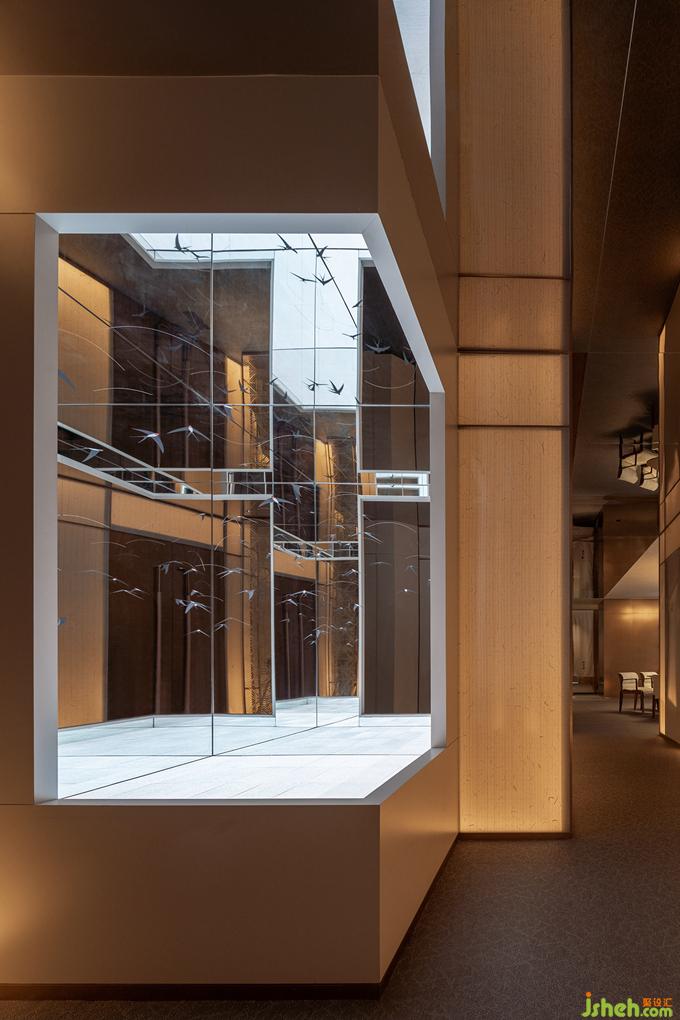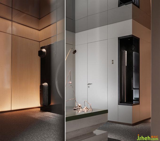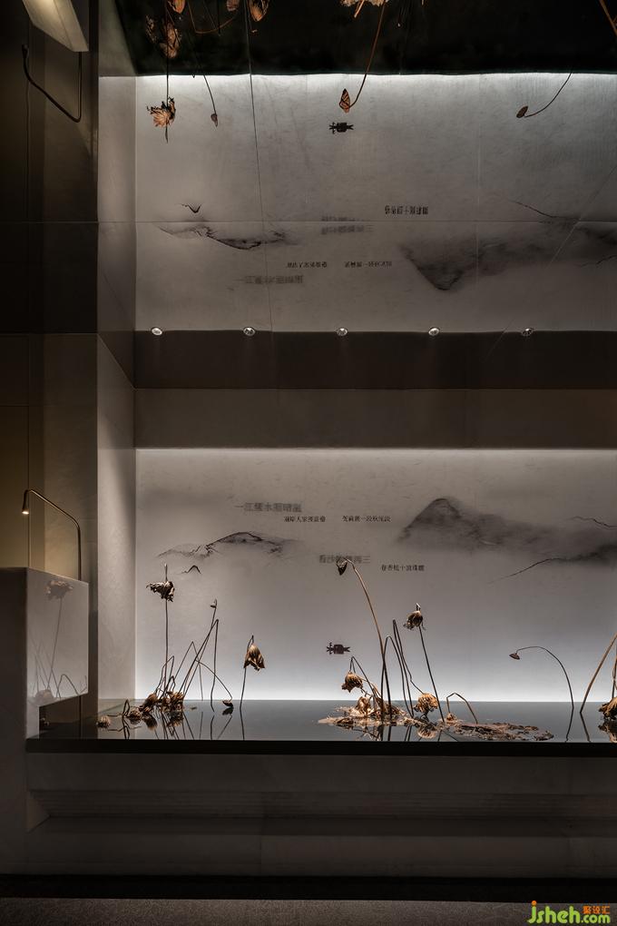 在“江南意象”的空間表現(xiàn)中,利用線條、色彩、形態(tài)、肌理等要素,對具有鮮明文化符號意義的雪、水、橋、欄等景致與風(fēng)物,進(jìn)行拆解集合并加以當(dāng)代藝術(shù)的注腳,依循包間各自的結(jié)構(gòu)與采光條件,杭州餐廳設(shè)計營造動態(tài)更迭的“劇幕”場景和豐富層次的心境感知。藏于江南詩與水墨畫中的物象在虛實有無之間纏繞穿插,原發(fā)境域與悖謬想象基于異質(zhì)矛盾卻又相反相成,終究進(jìn)入嶄新意境而“成其所是”