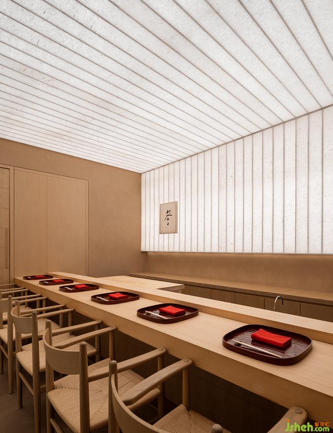 晴空·日本料理上海店藏在外灘BFC里,日本料理設(shè)計(jì)四面包裹的暖色石材像是熟練地畫家一抬筆便果敢地鋪上了柔和的底色,低調(diào)的門頭一側(cè)嵌著碧綠的水簾池,沿著一旁泛著微光的小徑探入,轉(zhuǎn)身便是山石流水構(gòu)筑的空靈意境。