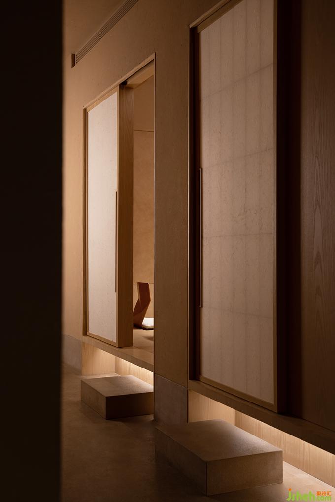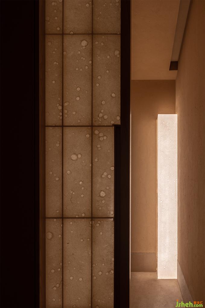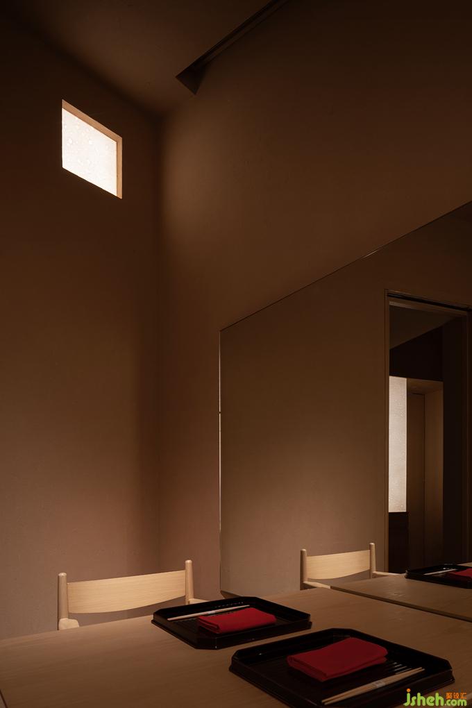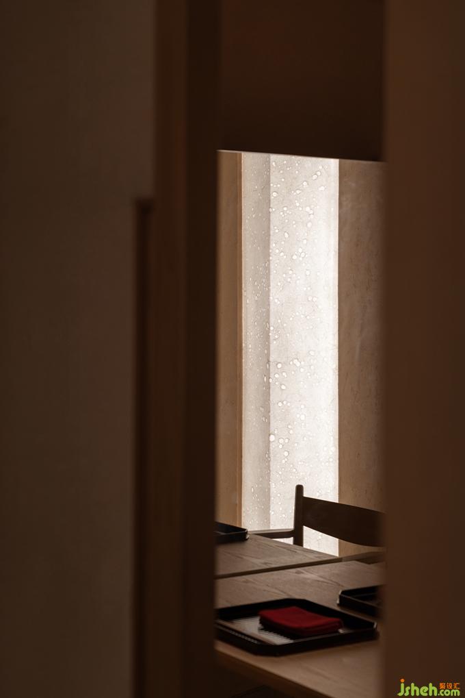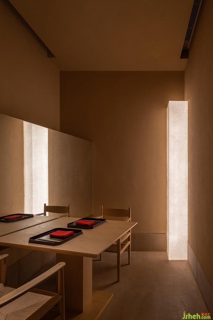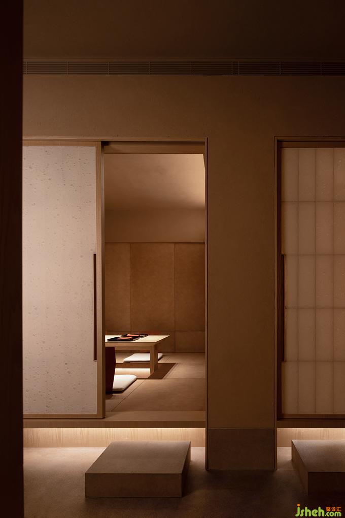 日本料理設(shè)計(jì)用光的克制也如繪畫的留白,廊道里只剩下微弱的光線指引著方向,餐廳設(shè)計(jì)駐足停留之處便任由光線透過(guò)和紙柔和地暈開(kāi),遠(yuǎn)近高低,變換著點(diǎn)、線、面的形態(tài),實(shí)驗(yàn)性地試探著人與物的關(guān)系。