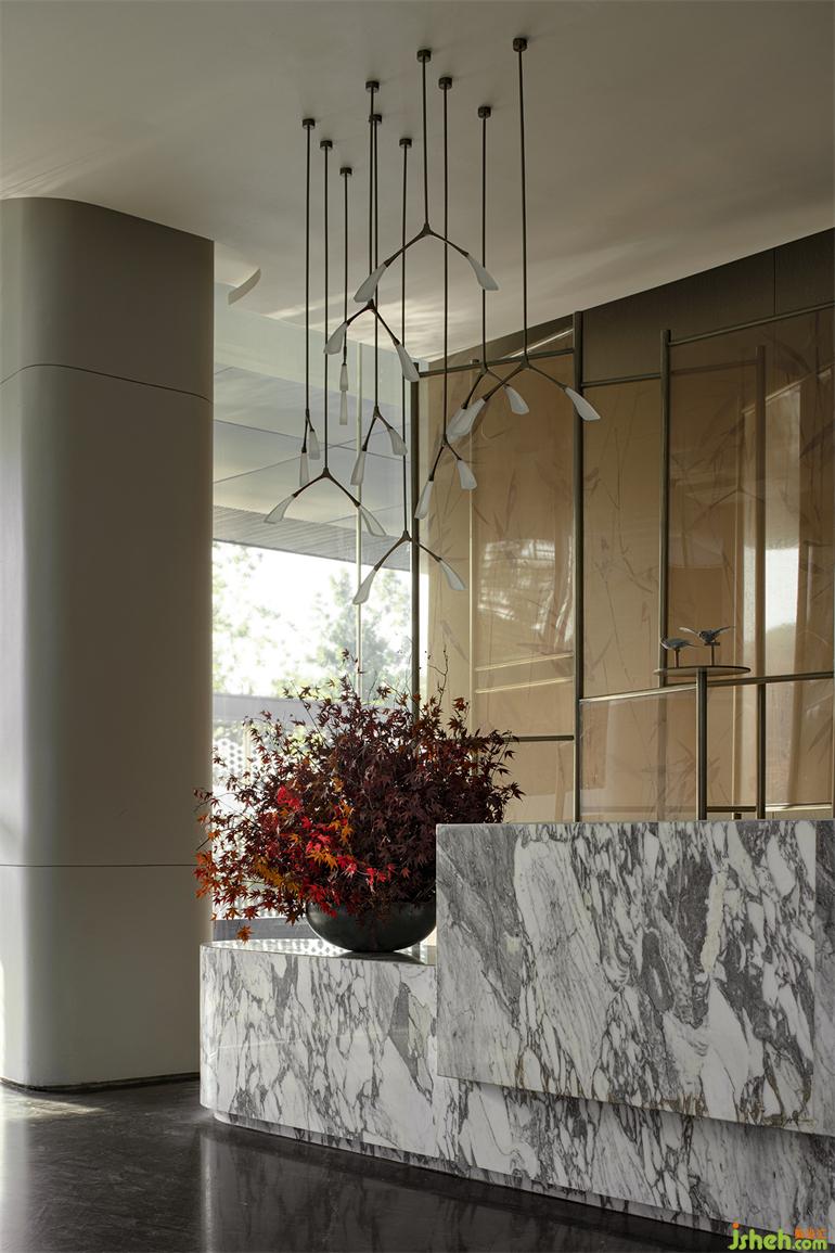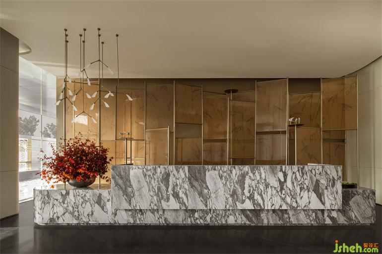 游園的起始,從駕一葉扁舟開始。接待區(qū)的背景屏風(fēng)若重疊的船帆,美學(xué)館設(shè)計(jì)也似自繁忙的運(yùn)河轉(zhuǎn)入了幽曲的水道,屏風(fēng)上綽綽的竹影是從鄭板橋《墨竹圖》里提取的筆意,引導(dǎo)來(lái)者婉轉(zhuǎn)入深林。而這位“揚(yáng)州八怪”里的代表人物,的確也代表著揚(yáng)州的人文風(fēng)骨。