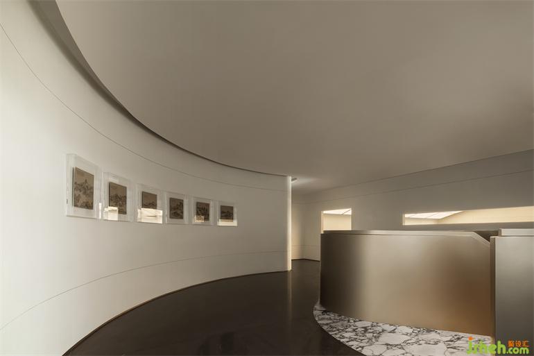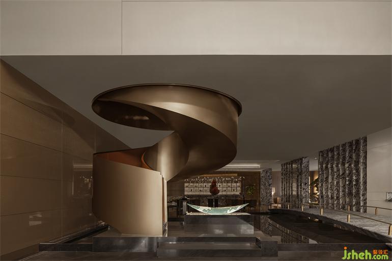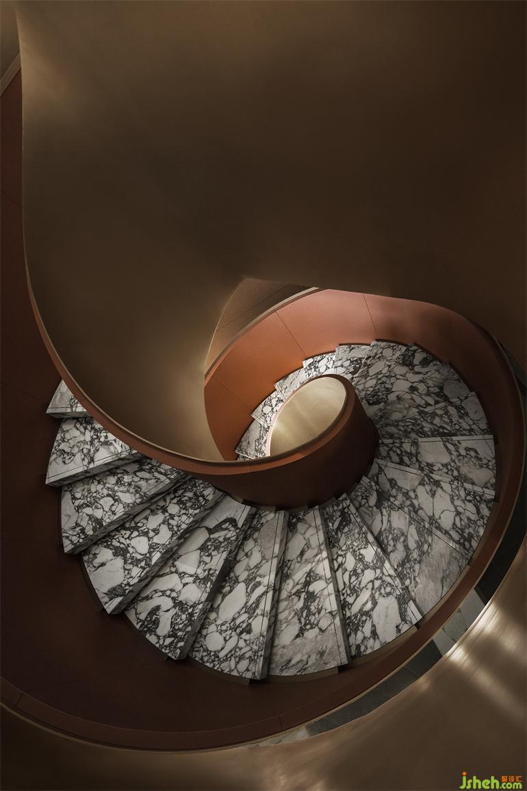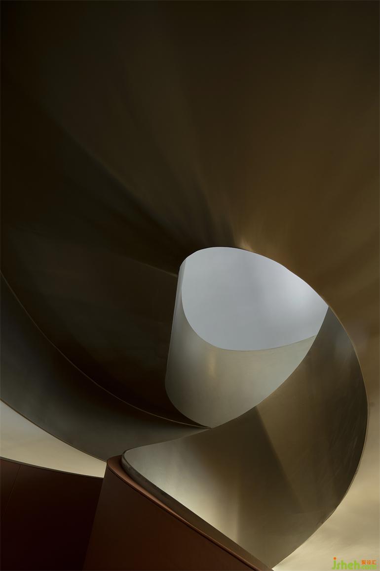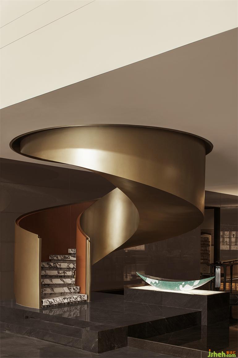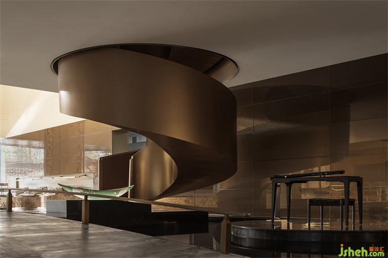 美學(xué)館設(shè)計空間中的視覺重點正是頗具現(xiàn)代感的金色旋轉(zhuǎn)樓梯,呈現(xiàn)出水與橋之間互文的流動感,又仿若連接傳統(tǒng)與現(xiàn)代的金色紐帶,瞬息間在文化的疊影里自在穿行。
