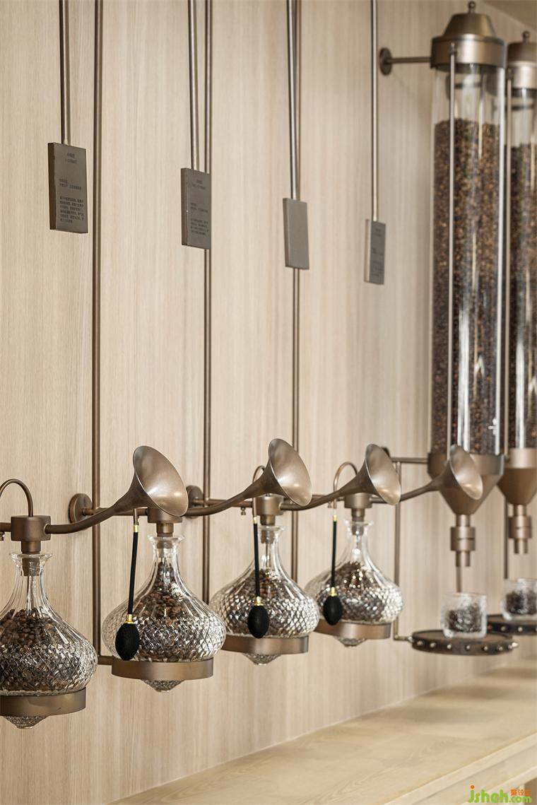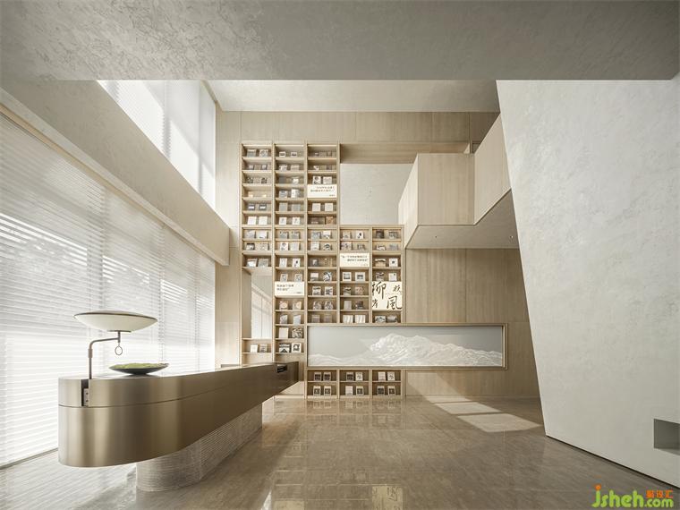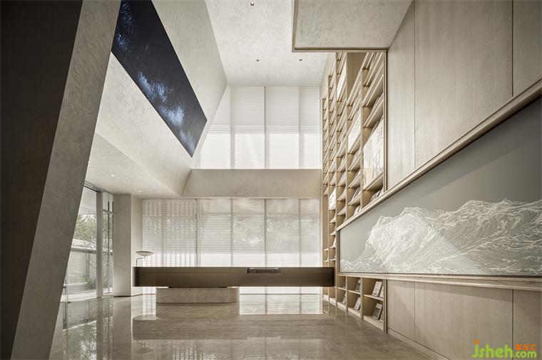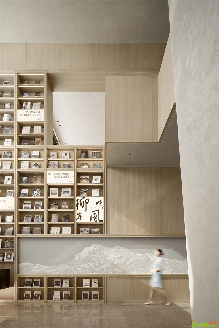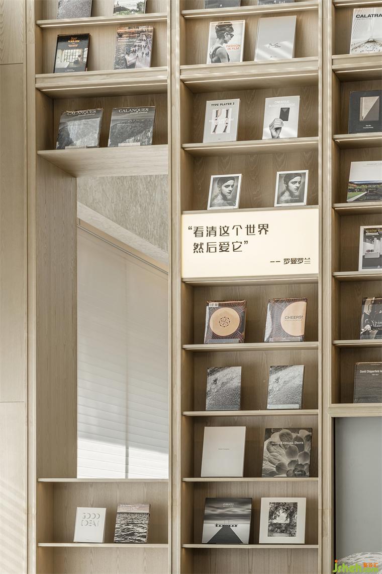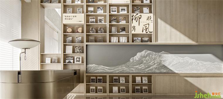 而作為整個(gè)作品的“序章”, 該項(xiàng)目的示范生活館設(shè)計(jì)也依此展開(kāi):從盤(pán)龍江取意,從《千里江山圖》取形,納自然入懷、融人文入境,再利用小型圖書(shū)館、精品咖啡品鑒角和互動(dòng)式手作區(qū)域等充滿強(qiáng)體驗(yàn)性和參與性的功能空間,營(yíng)造出一種在自然包圍中的沉浸式、復(fù)合型、社交性的城市美學(xué)空間氛圍,并通過(guò)這種場(chǎng)景式、角色化的空間體驗(yàn),在人與空間、藝術(shù)、物件之間建立起自然而然的情感連接。