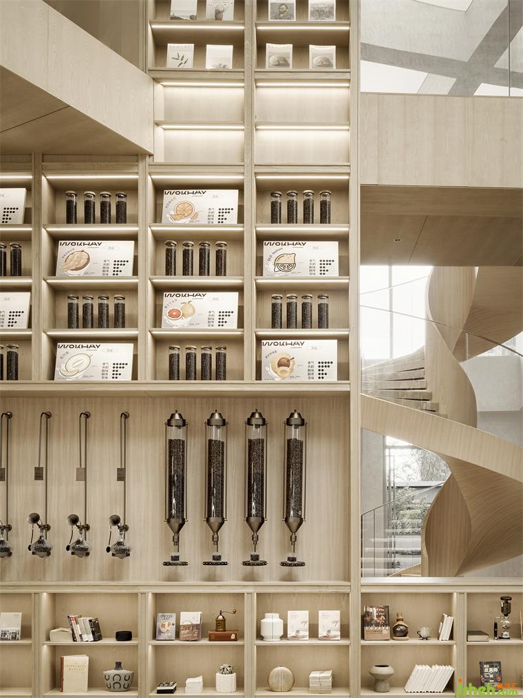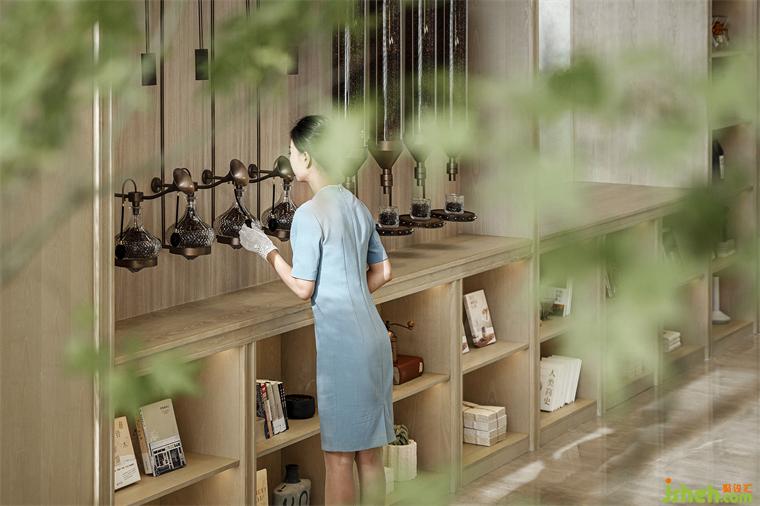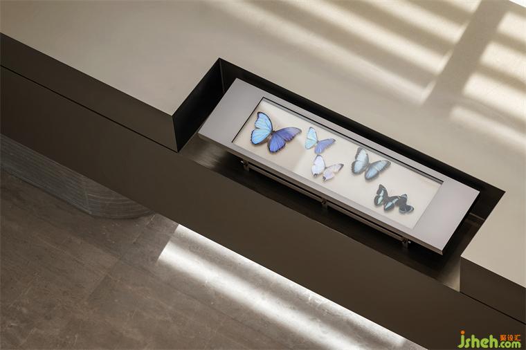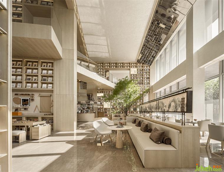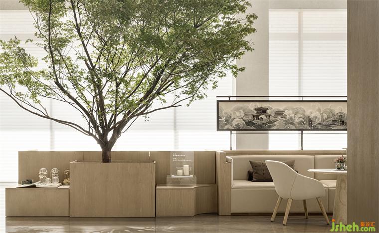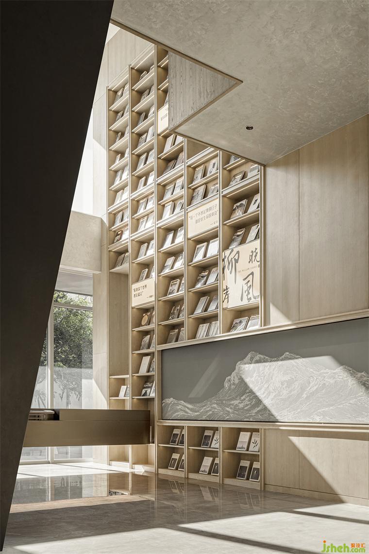 徜徉在昆明綠城&德潤柳岸曉風(fēng)生活館中,一種“城市之中,游林之外”的意趣伴隨始終。入口處的接待區(qū),收束的空間起到了引入的作用,這里閑雅寧和的木色調(diào)與中性色調(diào)在金屬、石材和木材的協(xié)奏中表達(dá)了整個(gè)設(shè)計(jì)的主題——書香趣游。靈活的建筑體塊將挑高充裕的空間進(jìn)行了得宜且活潑的排布調(diào)動(dòng),在圖書館式的高闊書墻背景下,室內(nèi)設(shè)計(jì)師甚至形成了一、二層的動(dòng)線互文。至于書墻上那幅如手卷般橫向展開的藝術(shù)畫作則進(jìn)一步勾起“游人”的好奇,引人“緣溪行”,繼而忘路之遠(yuǎn)近。
