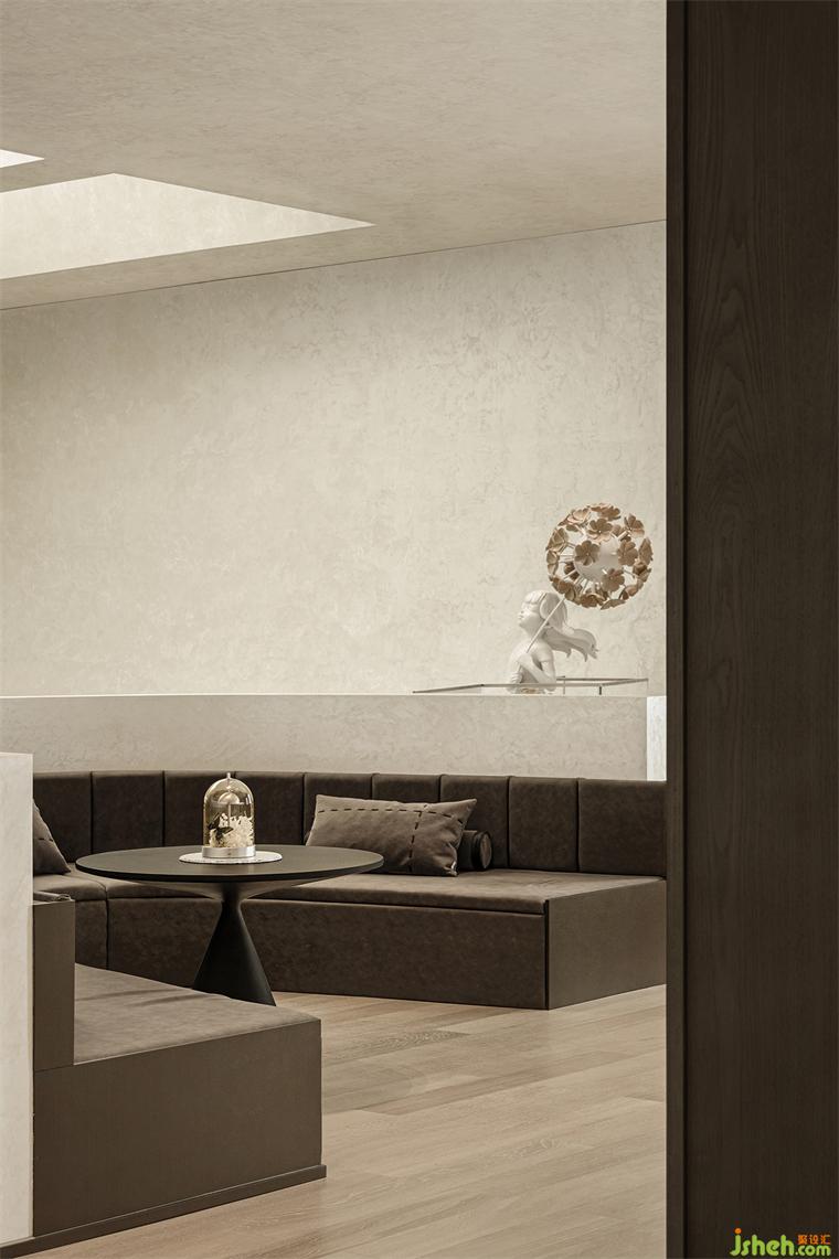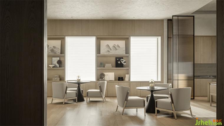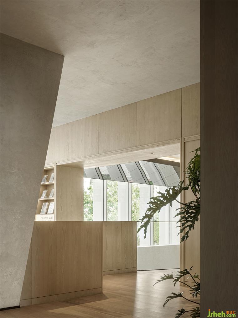繼續(xù)前行,整面玻璃落地墻引入的自然光線讓洽談區(qū)顯得豁然開朗。而目光的第一落點(diǎn)——花藝導(dǎo)臺(tái)上的那棵蔥郁靈動(dòng)的青楓則讓人的眼睛和心靈都同時(shí)明亮起來,一股清新的生命力就這樣充盈于室。室內(nèi)設(shè)計(jì)師而由此延伸出去的矮書柜及書柜上再次橫向拉開的畫作仿佛藝術(shù)屏風(fēng)般軟性區(qū)隔出內(nèi)外兩個(gè)座談空間。