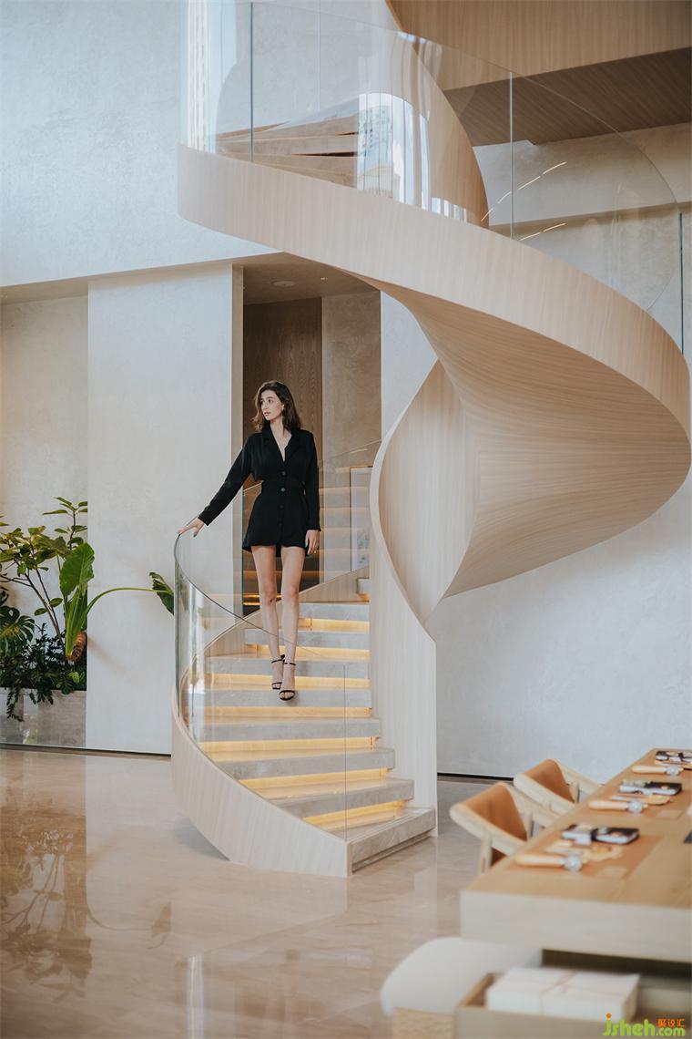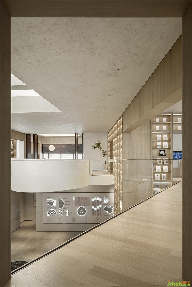 從手作區(qū)側(cè)旁的裝置藝術(shù)般的螺旋樓梯拾級(jí)而上,就來到了可以俯瞰整個(gè)書香空間的二層。這里是一片更為純靜的世界,斜向的空中連廊將各個(gè)空間貫通,通頂?shù)拇髸芤廊画h(huán)伺,尤其是在圍合一隅的書吧與畫廊區(qū),室內(nèi)設(shè)計(jì)師恍惚間竟有種身在圖書館藝?yán)鹊臅闼嚵种小K^書中自有山水日月,“游人”在這些名人書頁和畫跡中逡巡,尋覓關(guān)于自然天地或人文藝術(shù)的美妙瞬間,也恰如在暢游精神的園林了。