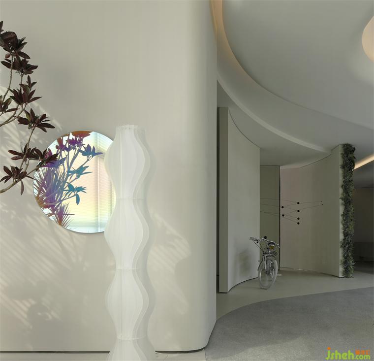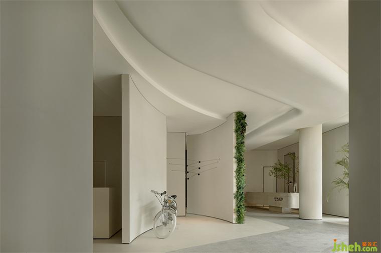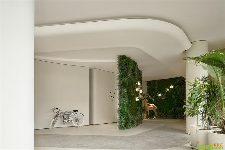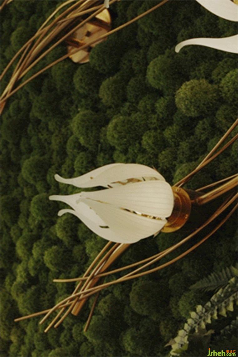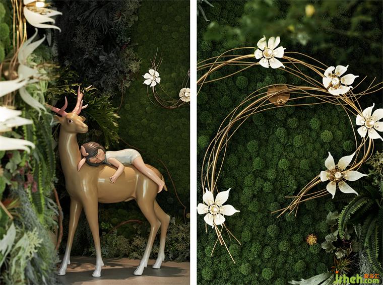 兩面花藝肌理的綠植墻,語調清新,青苔、花朵、室內(nèi)設計師和林間散步的小鹿,皆以藝術化的表現(xiàn)形式成為空間的一部分,呼應了所處的自然溪谷絕妙的自然氛圍,成為了空間的主導。