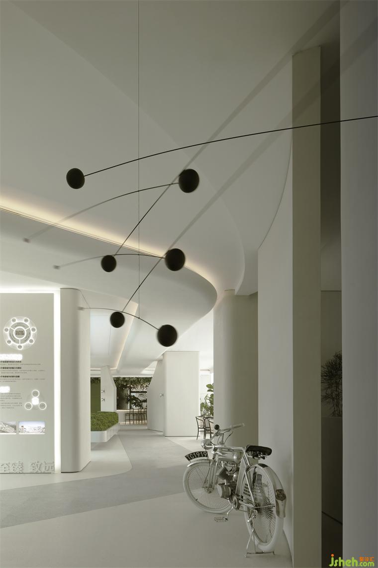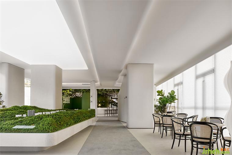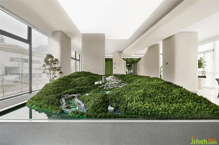 沙盤區(qū)與洽談區(qū)規(guī)劃為一處,室內(nèi)設計師兩面對外的落地窗將室外盎然的山水風景收進視野,曲線優(yōu)雅的編織藤椅略帶浪漫屬性,為舒適的談話、休憩提供了全然放松的環(huán)境氛圍。