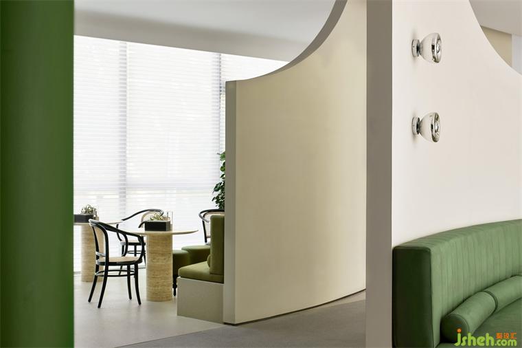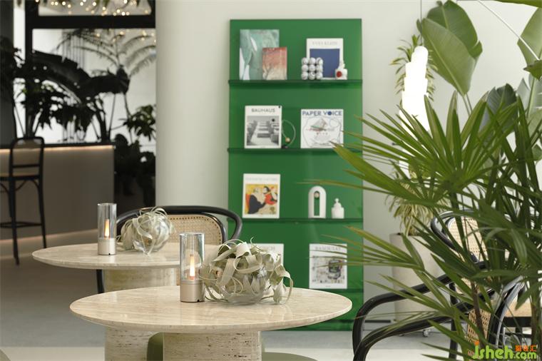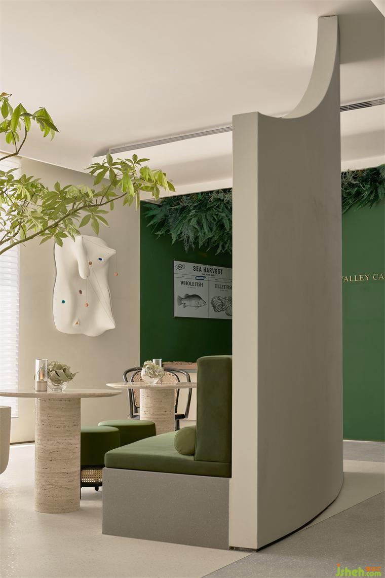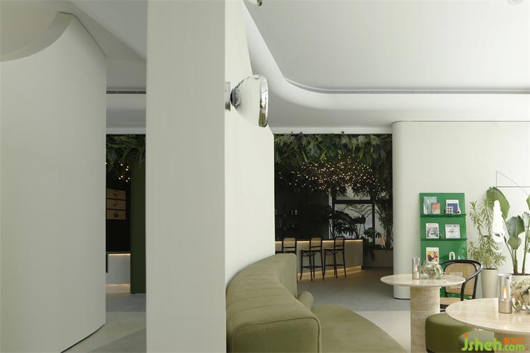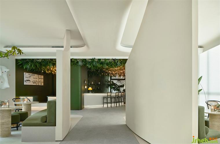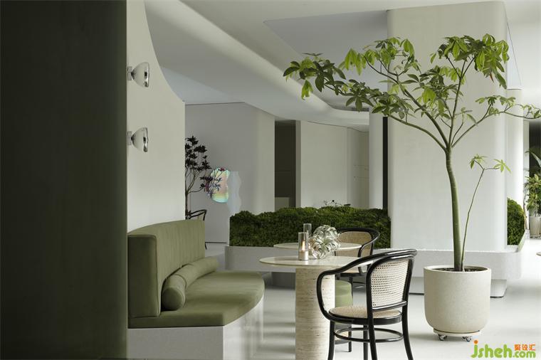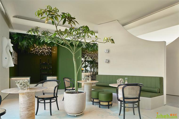 從天花如瀑布傾瀉而下的綠意,室內(nèi)設(shè)計師配合著交織、閃爍的藝術(shù)燈飾,像點點星光般、像流螢飛舞般,成為水吧區(qū)沉浸式花園體驗的重點表達。