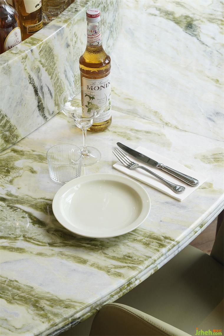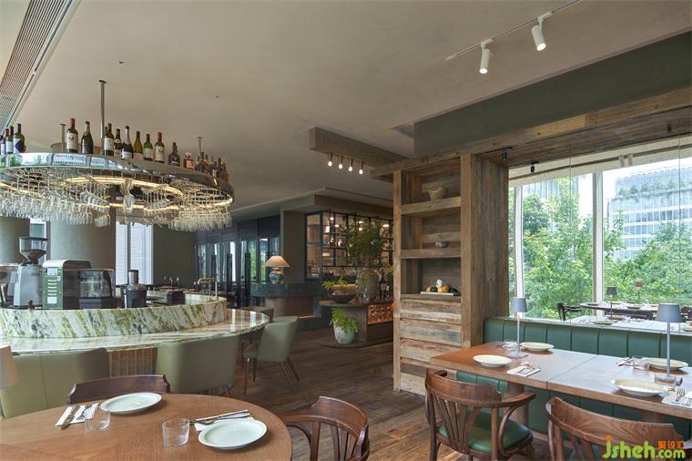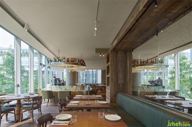就餐大廳靠園區(qū)中心廣場一側,景觀視角絕佳?;⌒伟膳_形體圍繞著圓形結構柱分布,如飛碟般帶著變色燈光的酒架懸浮于上方,餐廳設計極具雕塑感的吧臺區(qū)成為了大廳的視覺中心,兼做標準餐位和酒吧功能。