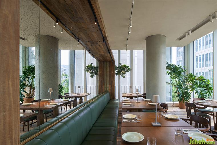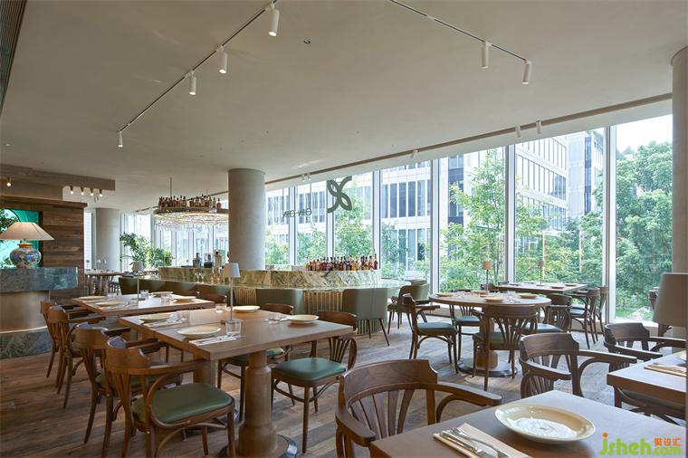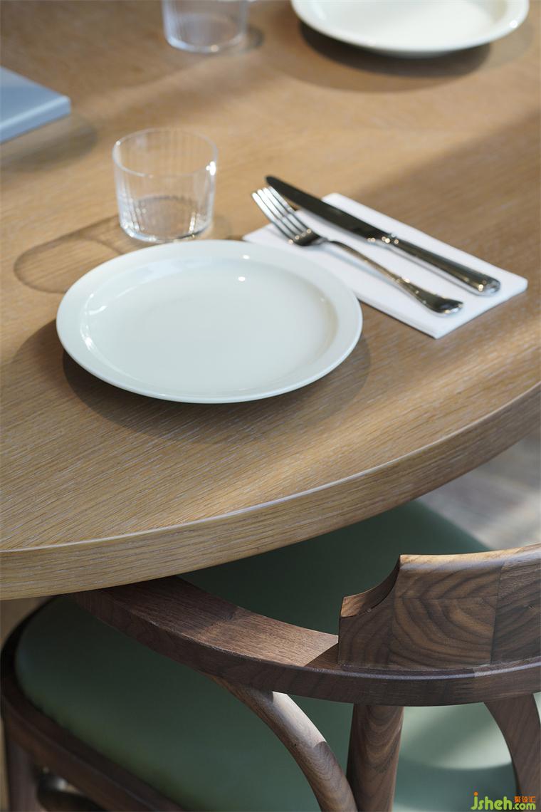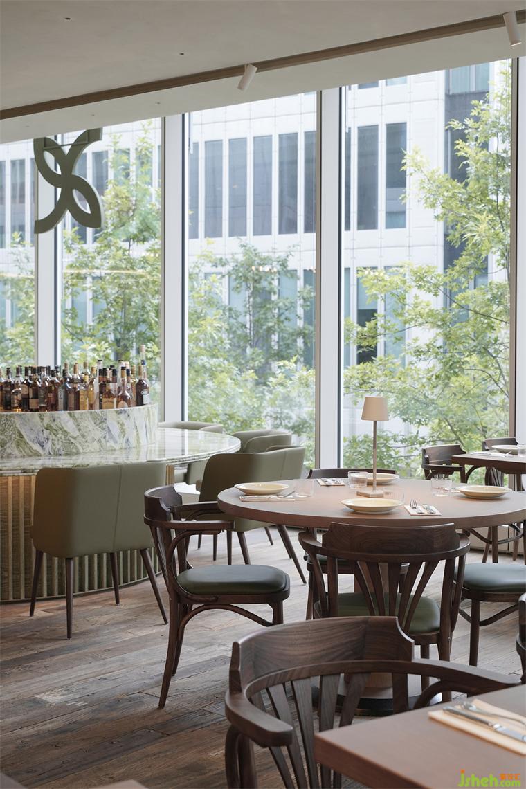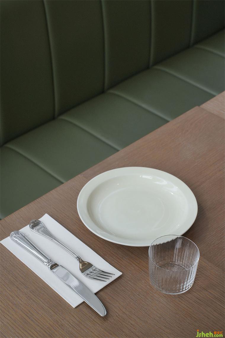 翡翠綠大理石紋理如甜點般質(zhì)感,搭配以綠色橡木紋理材質(zhì),餐廳設(shè)計整體以一種優(yōu)雅的姿態(tài),在餐廳入口的不遠(yuǎn)處,靜候客人的到來。