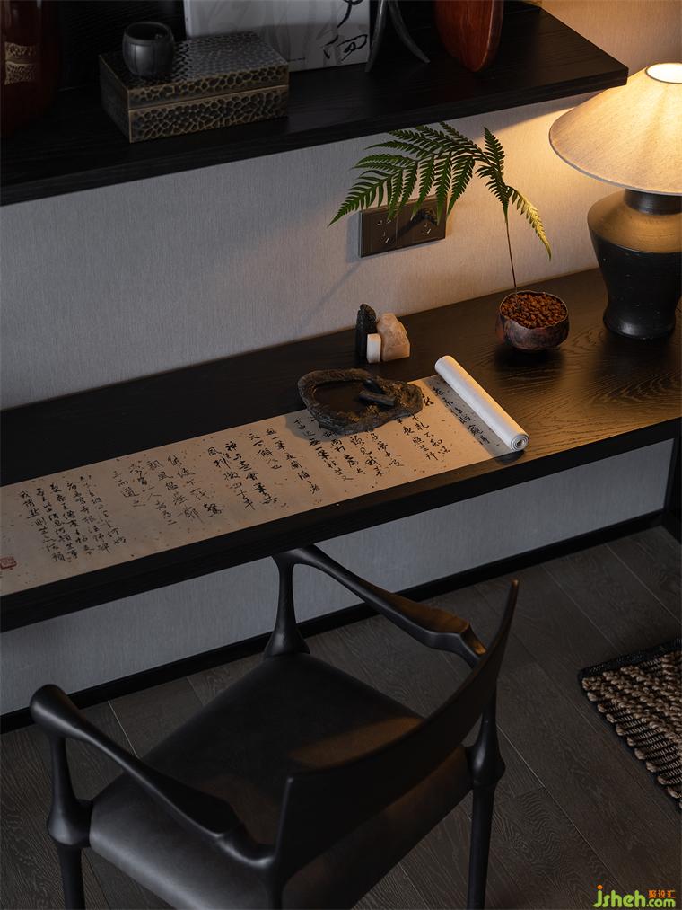 一桌一椅,重現(xiàn)文房雅趣。條桌,是古代文人用的書桌、畫桌?!堕L物志》說桌上“宜置盆景及古石”。長桌上的綠植與墻壁架上的器物,以沉靜的生命力,成就了主人的雅致樂趣。樣板房設計閑暇之時,心中之想,盡在筆下。一點一提,一撇一捺,一字一句。是對傳統(tǒng)的敬畏,也是風骨的傳承。