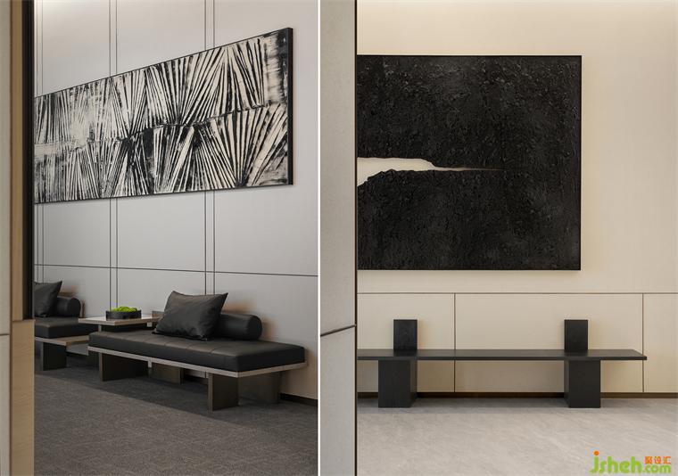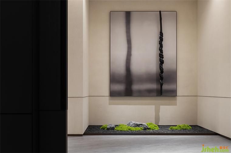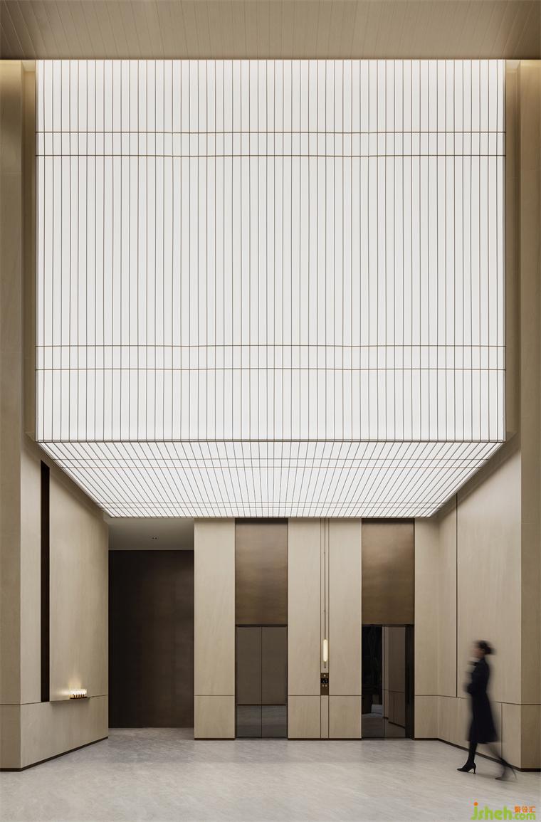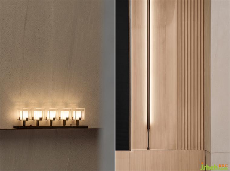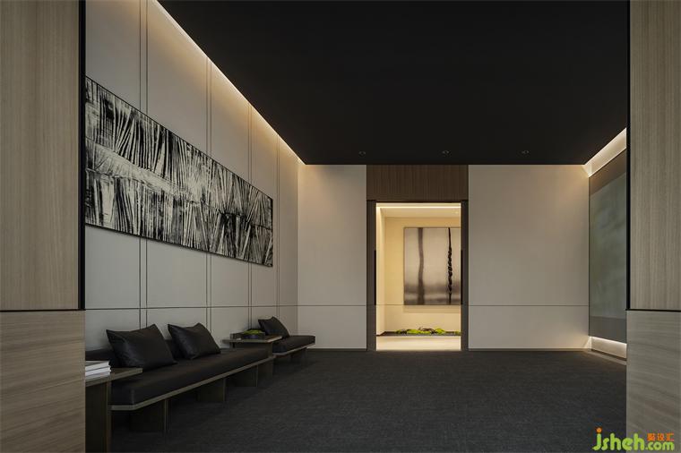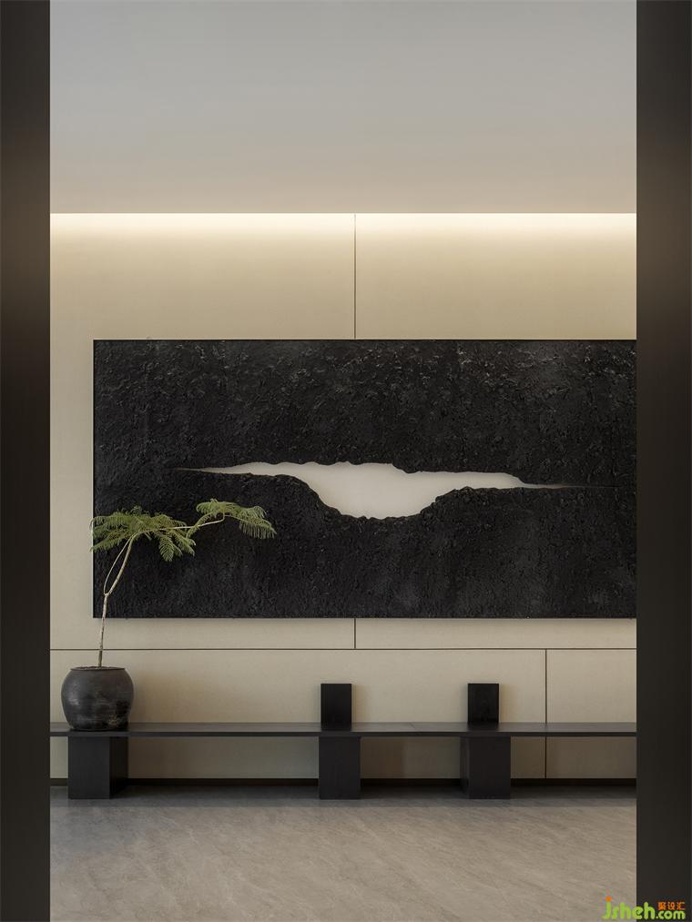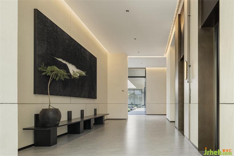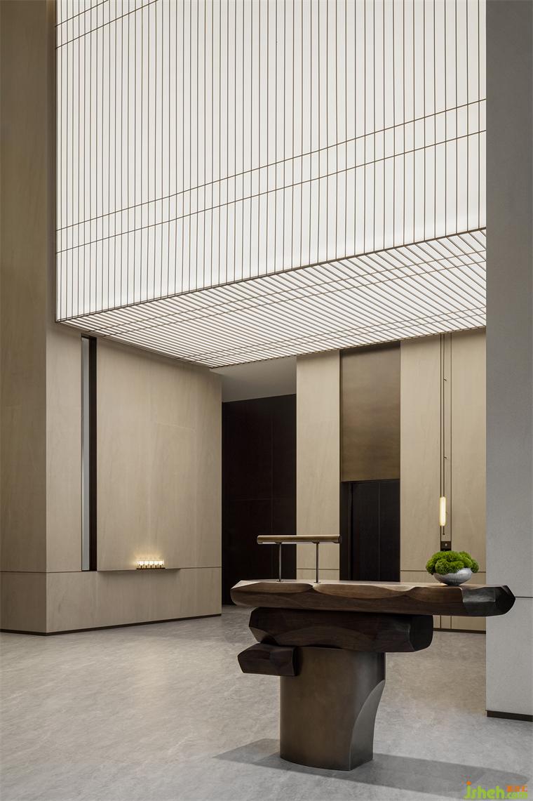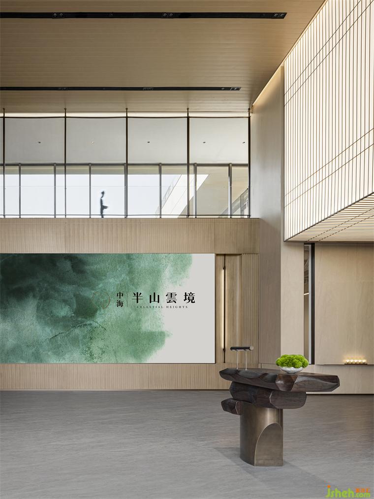 青松引路,從賓至如歸的酒店式入口開始,這場詩意洄游就拉開了它的序幕。沉穩(wěn)的硬木飾面與蒼郁的黛石塊面襯托出“山”的硬朗大氣,令高闊的接待大廳空間盡顯中正之氣。藝術(shù)化的木質(zhì)接待臺仿若案頭雅物,裝修設(shè)計值得玩味;隱現(xiàn)其間的金屬硬裝則增添了現(xiàn)代的質(zhì)感和調(diào)性,令偏居一側(cè)的懸浮感“光盒子”呈現(xiàn)出藝術(shù)性與魔幻感兼具的魅力。