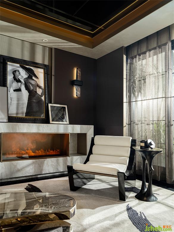 墻上的抽象風景與對面的溫暖壁爐