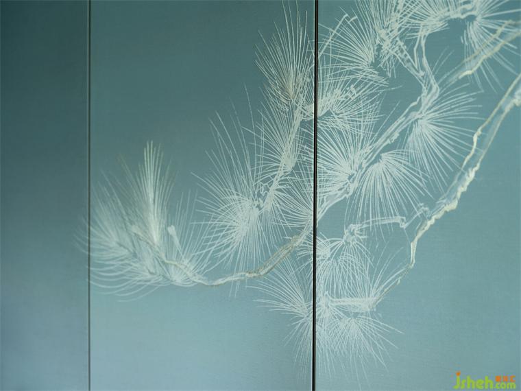 床頭墻壁以寧?kù)o的藍(lán)色風(fēng)帆裝飾,描以古松。