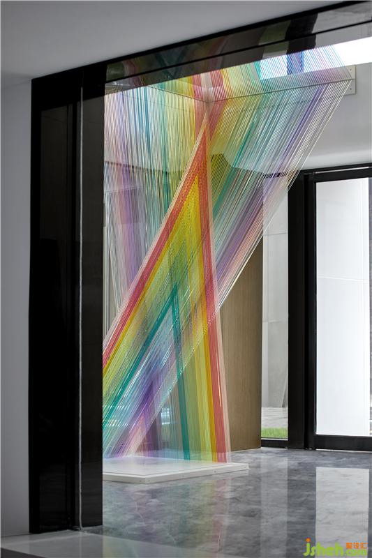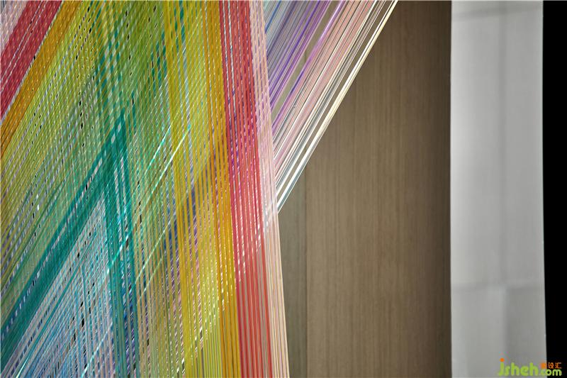 光如彩虹,有些刺眼照亮前方,帶領(lǐng)我們緩緩向前。彩虹如織,絲絲相扣,穿越空間。用絲絲彩虹繩營造出的空間裝置,讓空間光影如聚,充滿活潑韻律感。裝修公司