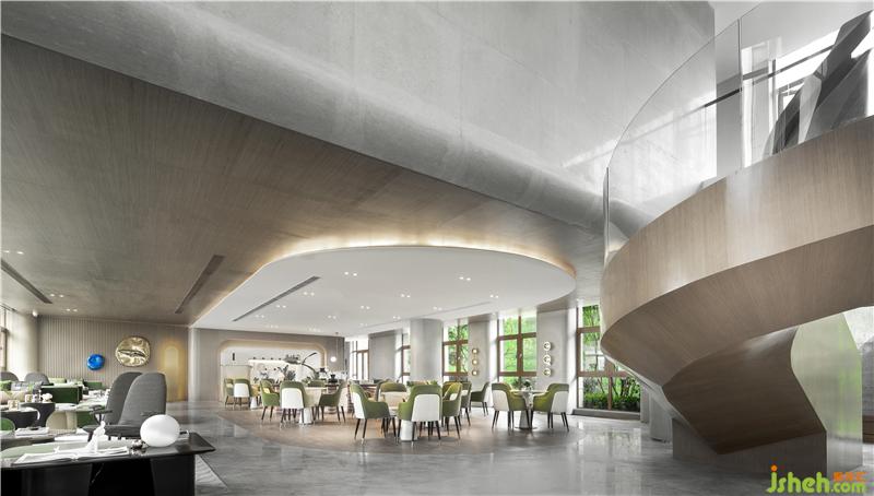 巨大的木質(zhì)螺旋樓梯用流動(dòng)的線條隱喻相對(duì)的熱鬧,與靜謐的空間形成鮮明的對(duì)比。定格在空中的兔子雕塑恰有歸家之意,形象地契合森林的主題。過(guò)渡空間獨(dú)具匠心的描繪一幅盎然生動(dòng)的畫面,行至此,感生活樂(lè)趣。