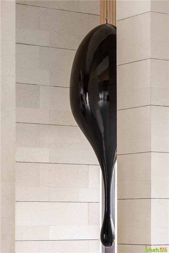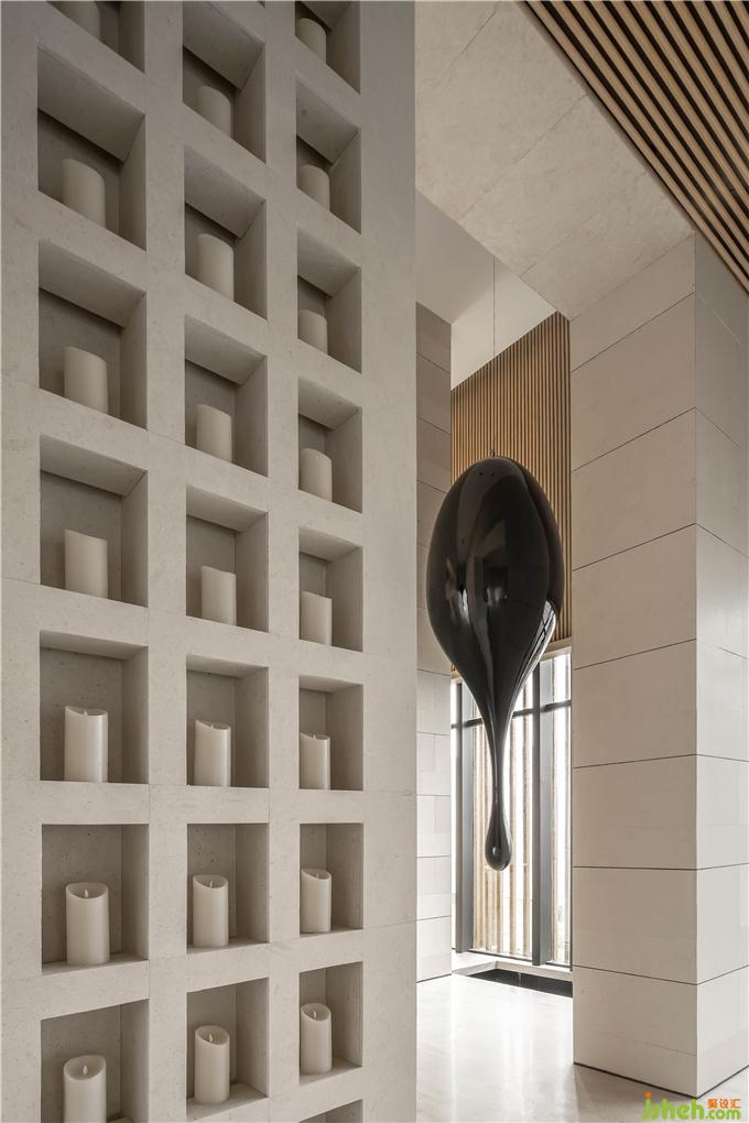 黑色的巨大藝術雕塑,肅穆而莊嚴,仿佛洞悉著世間萬物輪回的艱辛與沉苦。一墻的半透光景,再點亮萬壑燭光,讓氣闊的空間,多了更多的人生故事與縹緲的視覺氛圍。