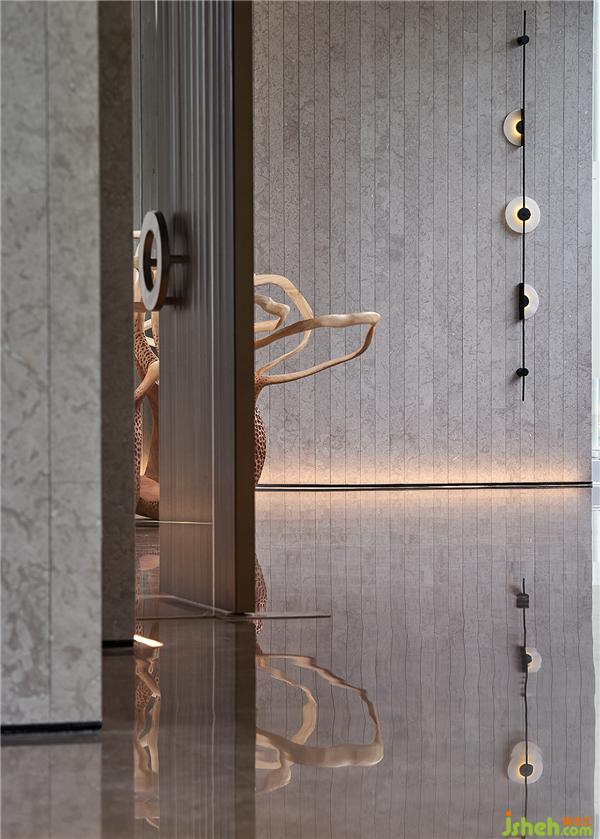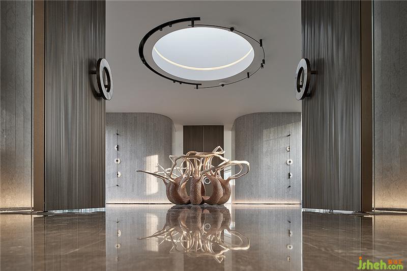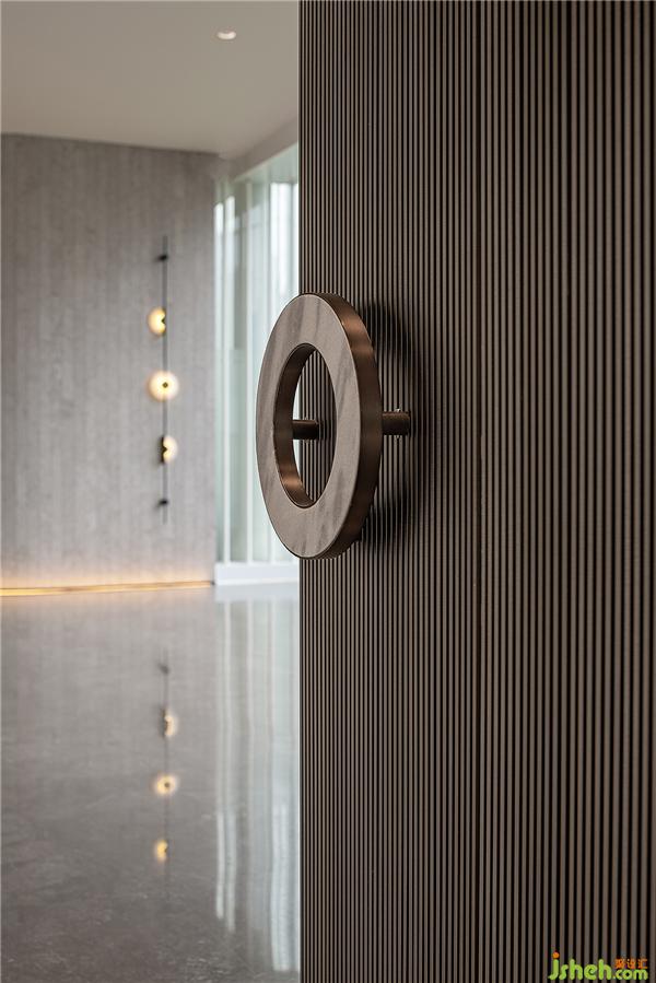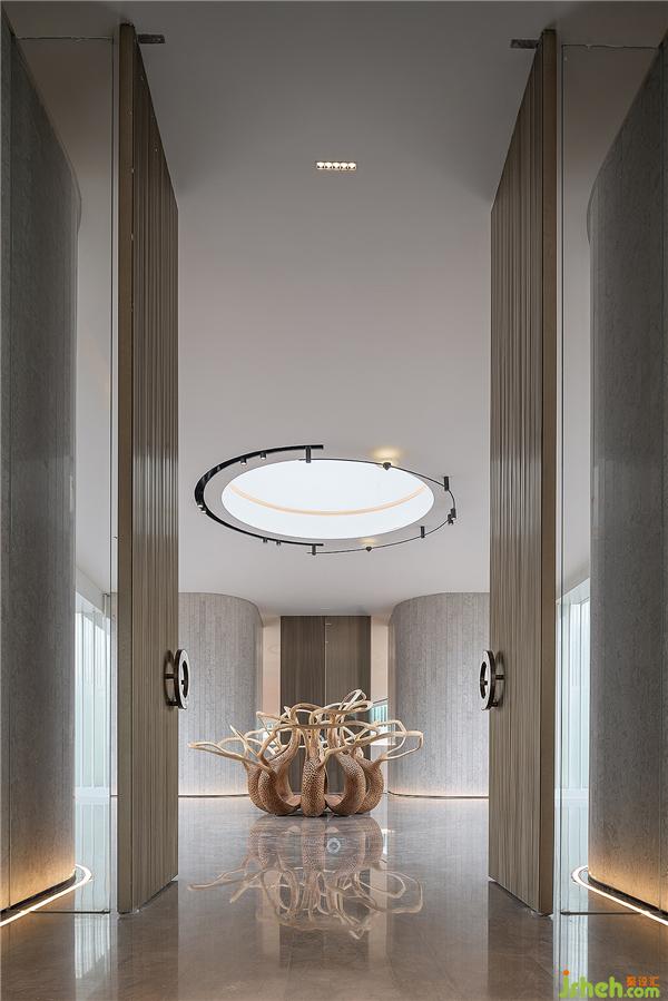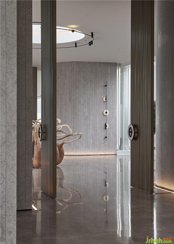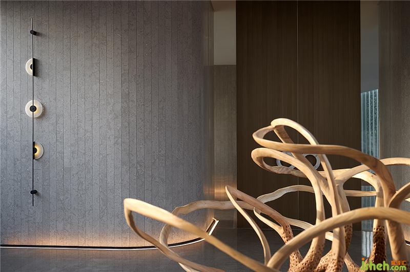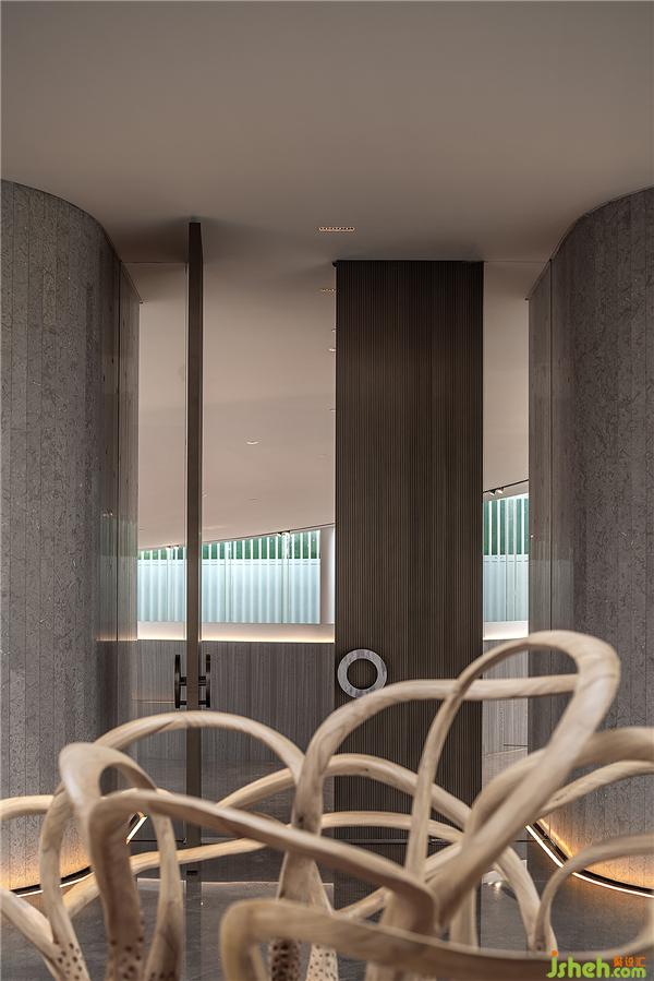 門廳作為入戶的門面,挑高設(shè)計(jì)呈現(xiàn)出天門中斷楚江開的磅礡氣勢(shì)。設(shè)計(jì)師透過圓弧壁面引導(dǎo)動(dòng)線,柳暗花明后進(jìn)入充滿開放感的室內(nèi)空間,創(chuàng)造豁然開朗的視覺效果,同時(shí)也反映武漢匯納百川的江湖氣蘊(yùn)。會(huì)所設(shè)計(jì)