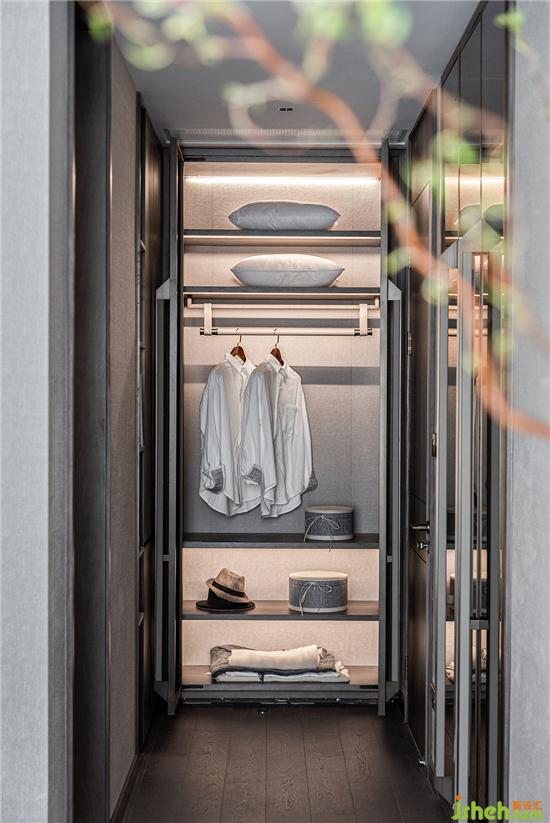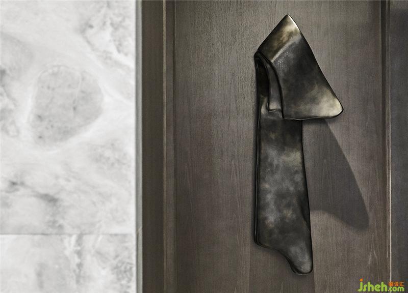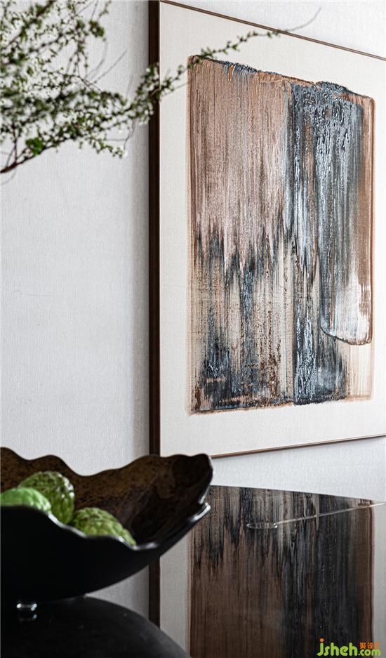 次臥空間中,褐色壁面保留材質(zhì)本身的肌理,有著時尚大器的利落表情,白色的臺燈,黑色的床頭柜,看似冷硬的觸感,因為鮮花與藝術擺飾的巧妙中和,展現(xiàn)出細膩而生動的表情。