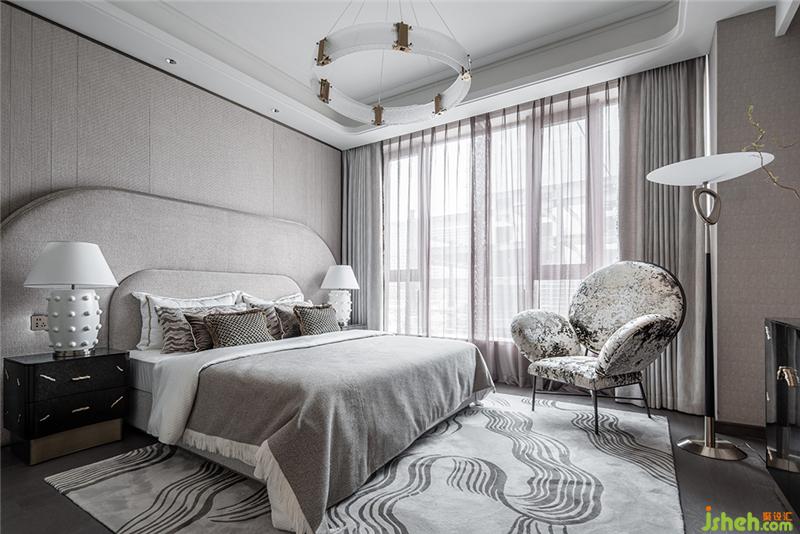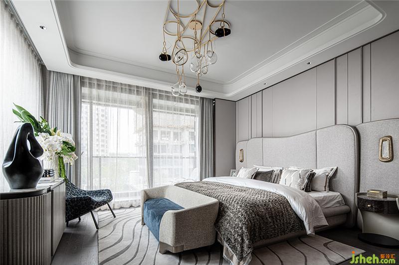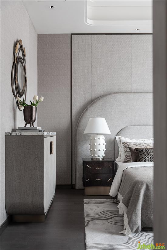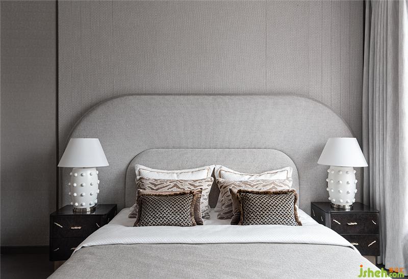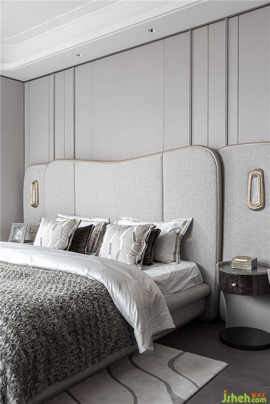 主臥在光線的設計師極其講究,注重營造視覺層次感。極具造型感的主燈,創(chuàng)造出劇場式光影,更加深了視覺張力。布面床頭背景使用布料材質(zhì),切割出有質(zhì)感的設計線條,纖維觸感同時呈現(xiàn)紓壓的寢居氛圍,營造一個真正能夠安適休息的私密空間。樣板房設計