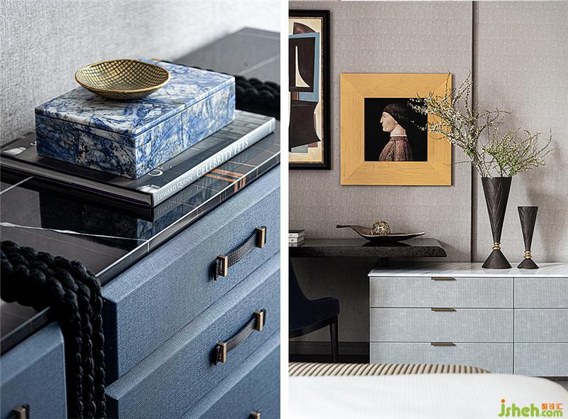 藝術(shù)是簡(jiǎn)潔的智慧,床頭背景畫作用抽象的方式講述空間美學(xué)。房間混搭布面、陶瓷、仿古銅拉絲不銹鋼等材料,利用硬材質(zhì)與臥室軟件的冷暖對(duì)比,呈現(xiàn)出的設(shè)計(jì)張力往往令人驚艷。