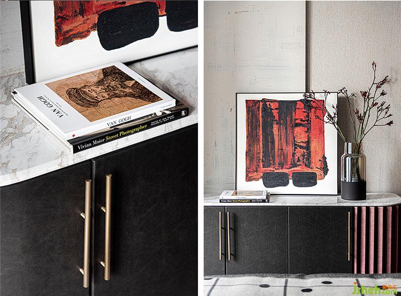 落地窗柔和地迎入暖陽,和暖色調(diào)的木系家具共同營造溫馨感。紅色黑色的基礎(chǔ)色調(diào)更加營造了主臥沉穩(wěn)與內(nèi)斂的氣質(zhì),插花與畫作提升了空間的藝術(shù)氛圍。