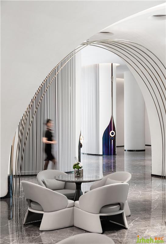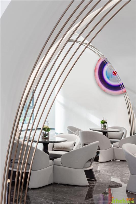 以水吧臺為中心,深恰區(qū)呈現(xiàn)出對稱之美,穩(wěn)重而和諧。交談間隙,轉(zhuǎn)頭間便可瞟見落地窗外景色,于室內(nèi)而追逐四季與光影的變化,感受時間的流轉(zhuǎn)。金屬線條附于圓潤墻面屋頂之上,如五線譜一般,等來思緒與思緒的碰撞,奏出優(yōu)美的音符。