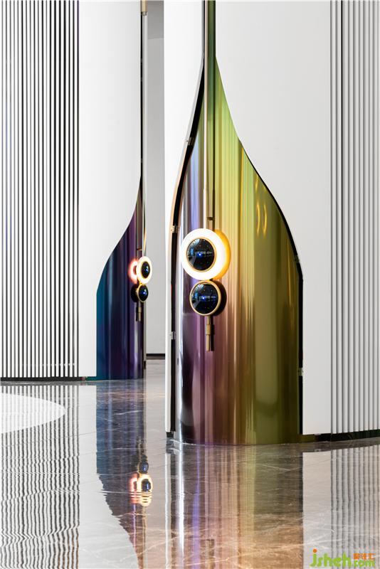 轉(zhuǎn)角處的圓柱,以典雅紫色與人們相遇。如陽光下孔雀的尾羽,光線交映下散發(fā)出迷人光澤,又倒影在大理石地面上,獨有一番風景。裝修公司