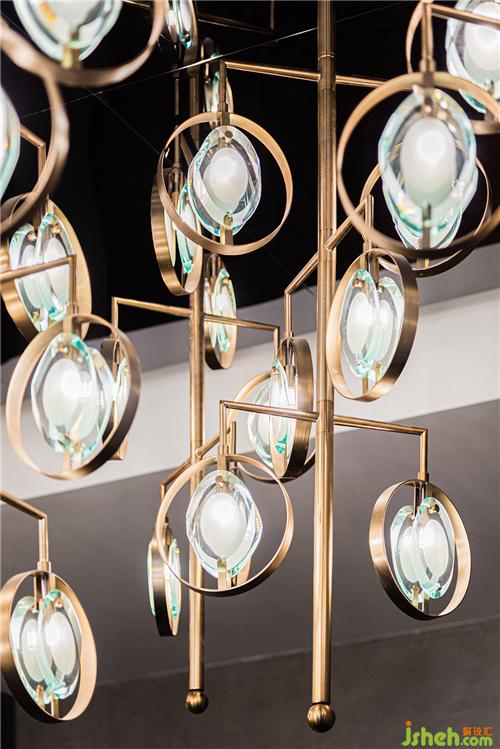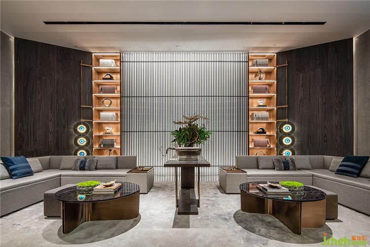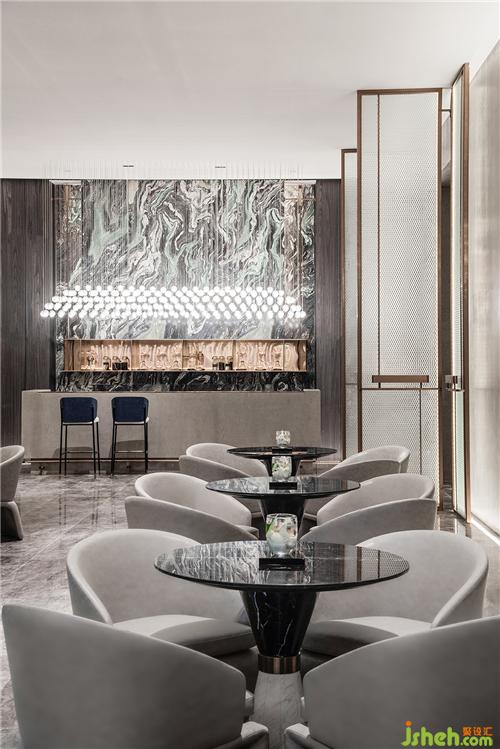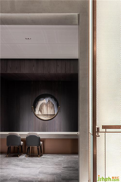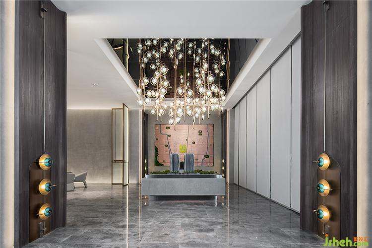 嚴(yán)謹(jǐn)規(guī)整的木門之后,沙盤(pán)區(qū)則是一派水光瀲滟的幽靜詩(shī)意。古銅金屬與玻璃交錯(cuò)形成的巨型吊燈自天花垂下,暖黃的光暈淡雅柔和。裝修設(shè)計(jì)