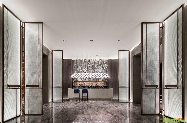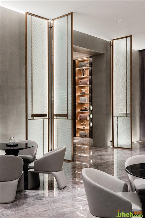 視線投向走廊盡頭,兩側(cè)帶有浮雕肌理的玻璃屏風(fēng)將空間的視覺(jué)效果向兩側(cè)延伸。設(shè)計(jì)師使空間呈現(xiàn)出水晶宮般的剔透,令區(qū)域的分割、空間的體驗(yàn)上也生出一種壯闊與氣韻。