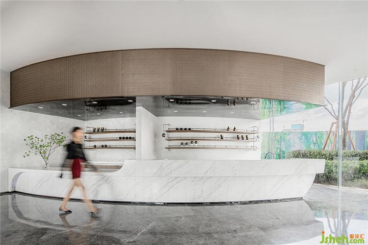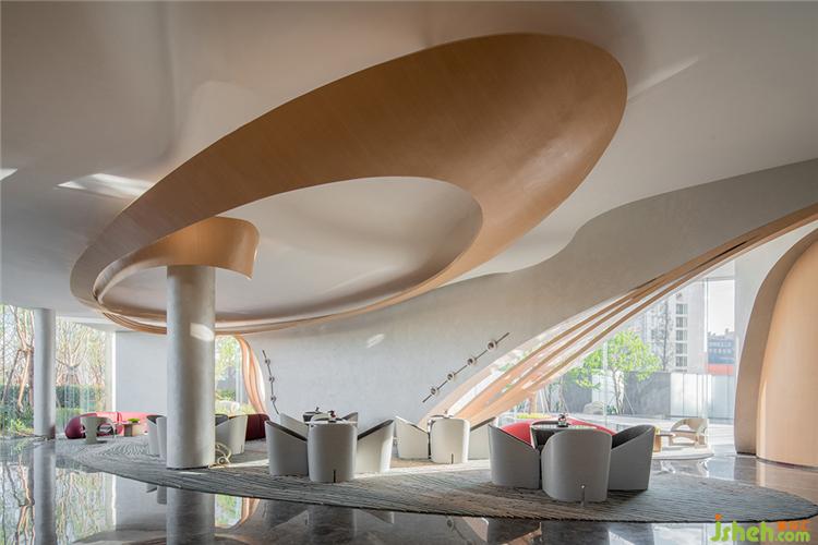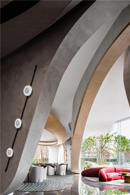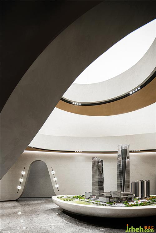 幾經(jīng)流轉(zhuǎn),景色豁然開朗,視野延伸至更開闊的境地,觀者在此完成心境的轉(zhuǎn)換。洽談區(qū)頂端延續(xù)沙盤區(qū)的手法,增添了板材的使用。