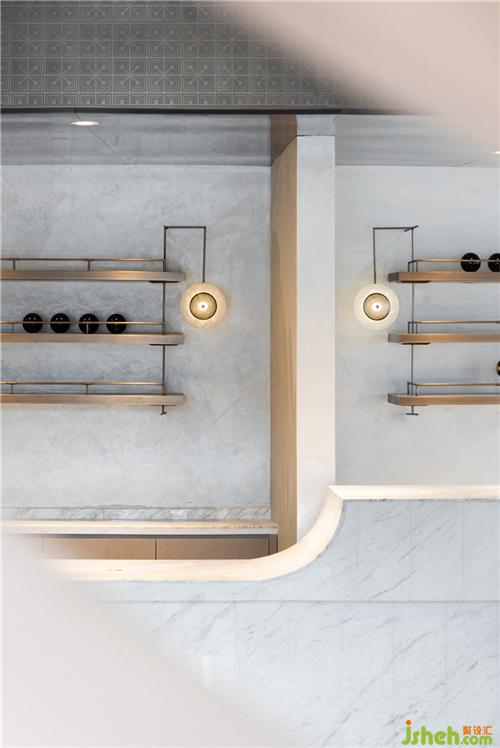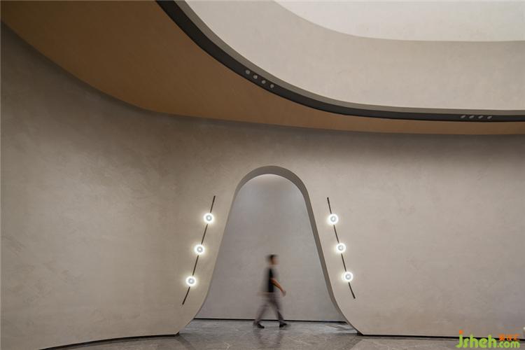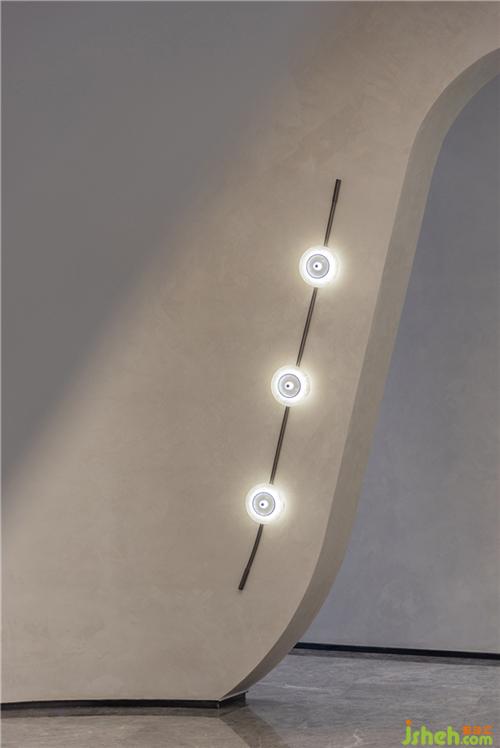 設計師借鑒現(xiàn)代美術館的設計手法,通過點、線、面的交錯與構成來表達空間的形態(tài)。圓形壁燈如明珠懸于墻上,與線條流暢的拱門與安謐的灰色墻面相襯,為整個空間籠罩了一層柔潤的光澤。