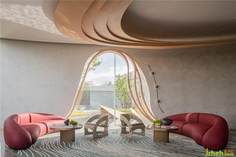 沙發(fā)區(qū)與洽談區(qū)之間以塊毯來劃分界限,半開半合,讓開敞的交談漸漸轉(zhuǎn)入舒緩的節(jié)奏。大范圍使用落地窗,通透的格局模糊了室內(nèi)外邊界,打造出親近自然、富有溫度的美學社區(qū)。