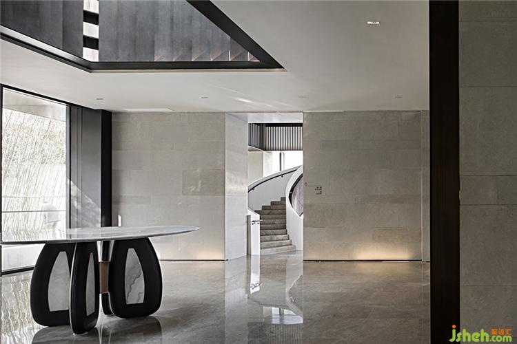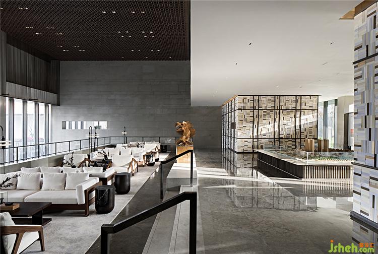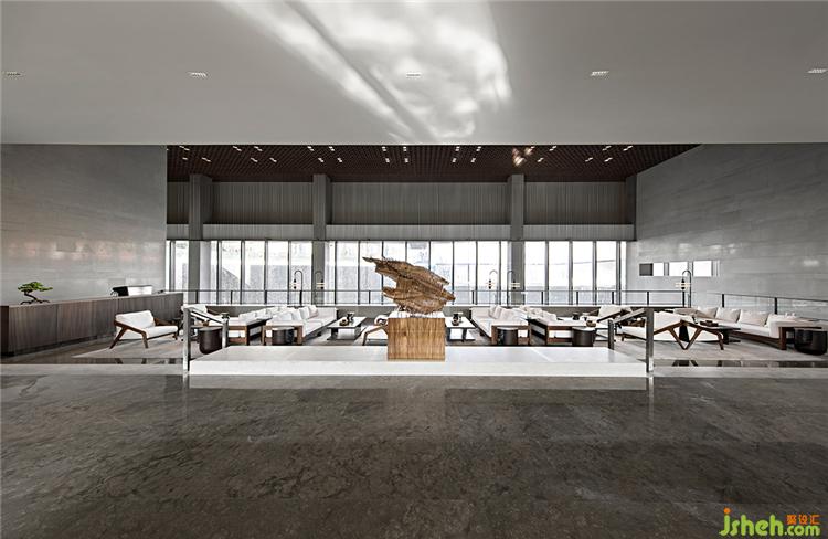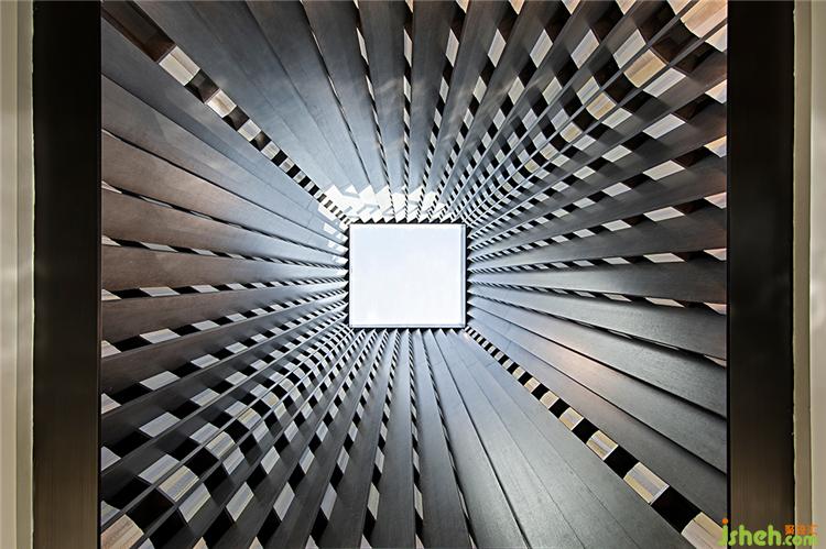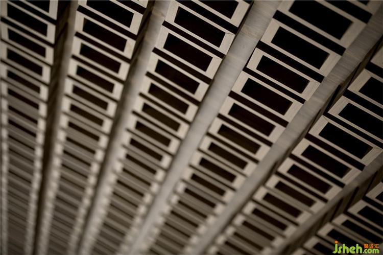WJID融數(shù)學(xué)思想于設(shè)計,將空間頂部中空,堆疊鋪構(gòu)金屬板材,使天光得以柔和地灑落,售樓處設(shè)計實現(xiàn)美學(xué)與功能性的統(tǒng)一。