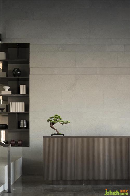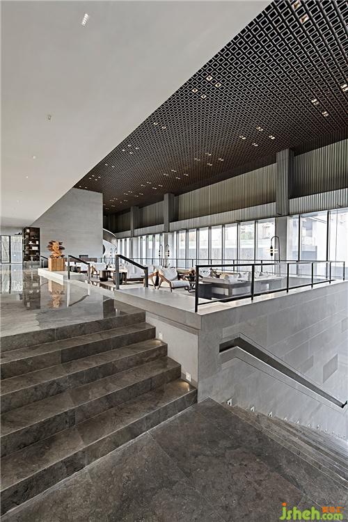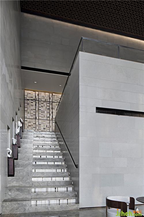 由樓梯轉(zhuǎn)入一層空間,側(cè)面使用篆刻中的陰刻手法刻出扶手,顯示人性溫度的同時(shí),又保有了美學(xué)態(tài)度。