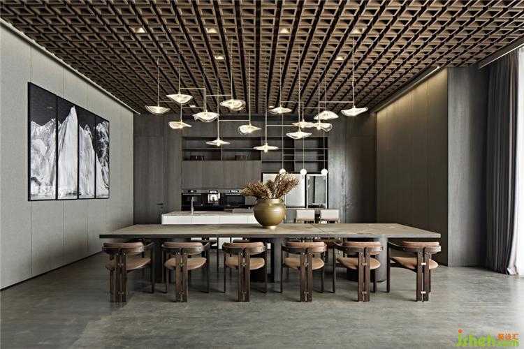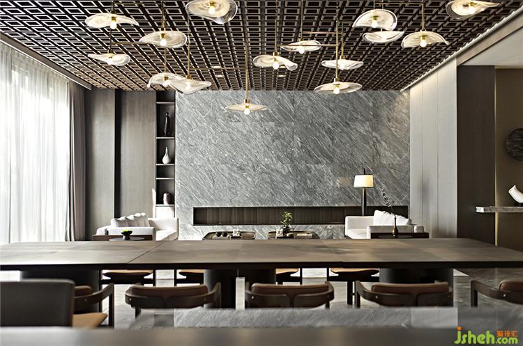 起伏的曲線燈具捕捉了水波紋的動態(tài),讓溫和的光影覆蓋其室,有著空中流水之感,增添了空間的靈動與優(yōu)雅。