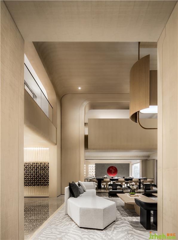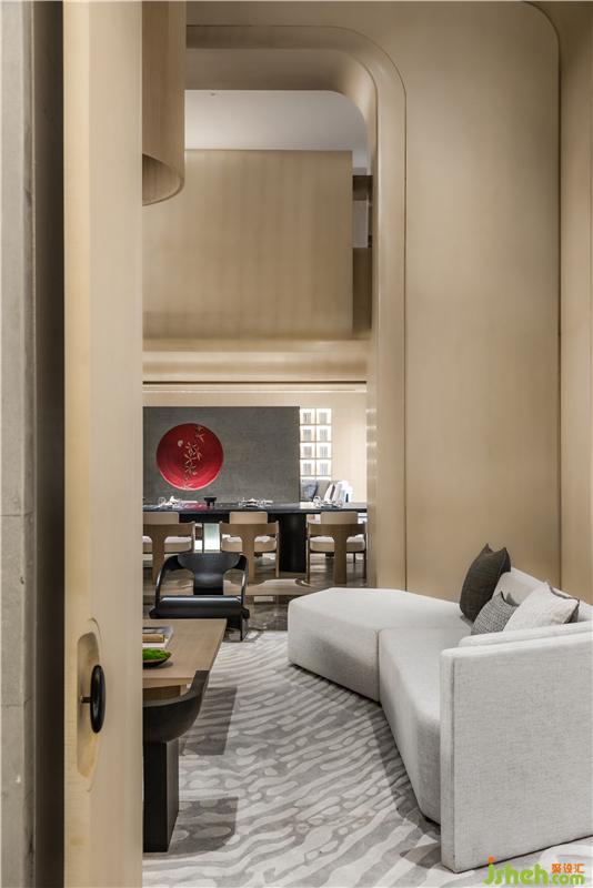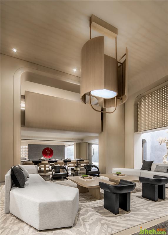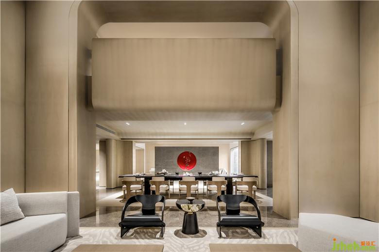 設(shè)計師提取卷軸元素,將其形態(tài)運用到天花造型,半高的背景墻與頂面脫開,空間霎時變得清晰舒朗。穿插尺度夸張的體塊,突出空間的氣勢,詮釋現(xiàn)代世家禮儀。